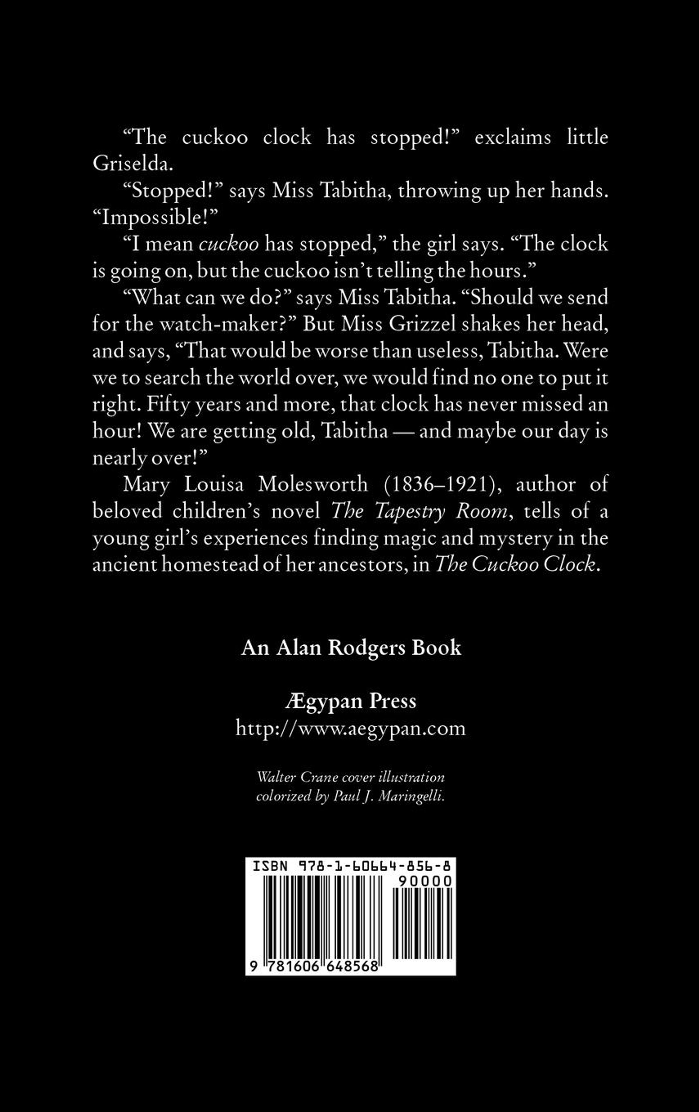 "The cuckoo clock has stopped!" exclaims little Griselda. "Stopped!" says Miss Tabitha, throwing up her hands. "Impossible!" "I mean cuckoo has stopped," the girl says. "The clock is going on, but the cuckoo isn't telling the hours." "What can we do?" says Miss Tabitha. "Should we send for the watch-maker?" But Miss Grizzel shakes her head, and says, "That would be worse than useless, Tabitha. Were we to search the world over, we would find no one to put it right. Fifty years and more, that clock has never missed an hour! We are getting old, Tabitha -- and maybe our day is nearly over!"