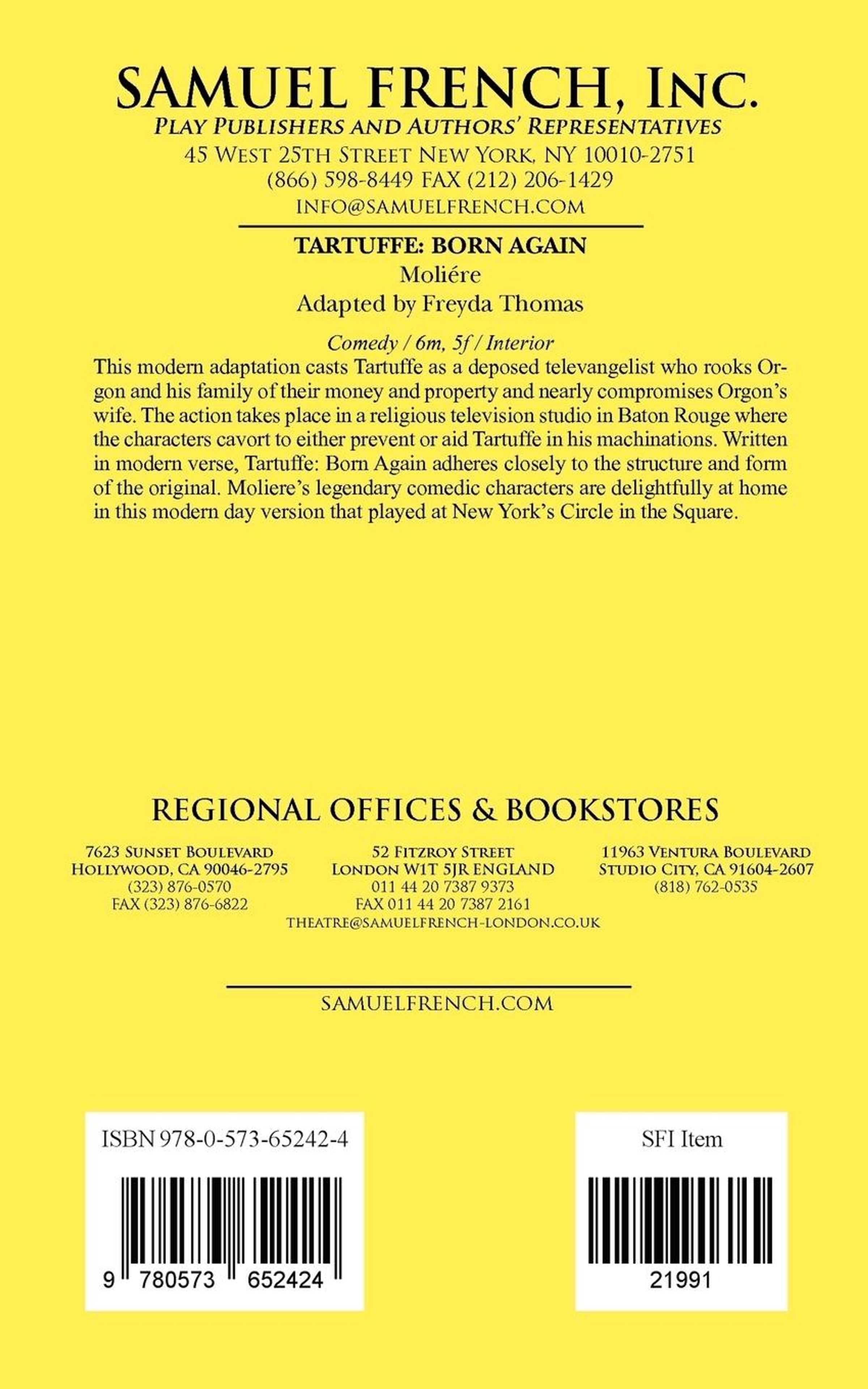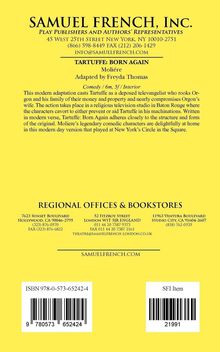 Comedy / 6m, 5f / Int. This modern adaptation casts Tartuffe as a deposed televangelist who rooks Orgon and his family of their money and property and nearly compromises Orgon's wife. The action takes place in a religious television studio in Baton Rouge where the characters cavort to either prevent or aid Tartuffe in his machinations. Written in modern verse, Tartuffe: Born Again adheres closely to the structure and form of the original. Moliere's legendary comedic characters are delightfully