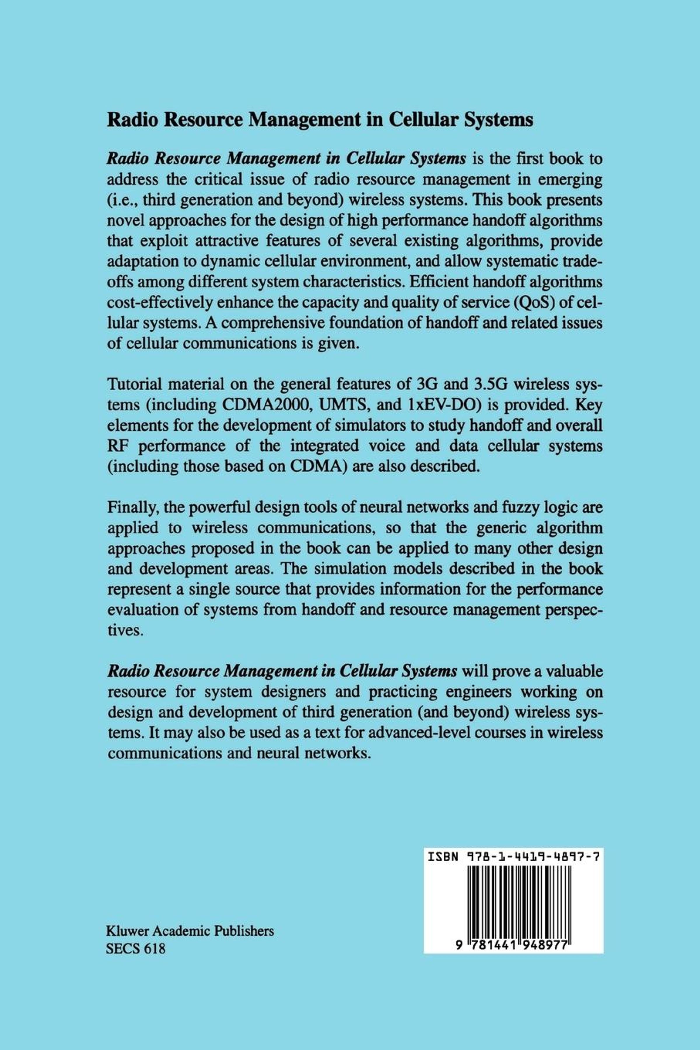 Radio Resource Management in Cellular Systems is the first book to address the critical issue of radio resource management in emerging (i. e., third generation and beyond) wireless systems. This book presents novel approaches for the design of high performance handoff algorithms that exploit attractive features of several existing algorithms, provide adaptation to dynamic cellular environment, and allow systematic tradeoffs among different system characteristics. Efficient handoff algorithms cost-effectively enhance the capacity and quality of service (QoS) of cellular systems. A comprehensive foundation of handoff and related issues of cellular communications is given. Tutorial-type material on the general features of 3G and 3.5G wireless systems (including CDMA2000, UMTS, and 1xEV-DO) is provided. Key elements for the development of simulators to study handoff and overall RF performance of the integrated voice and data cellular systems (including those based on CDMA) are also described. Finally, the powerful design tools of neural networks and fuzzy logic are applied to wireless communications, so that the generic algorithm approaches proposed in the book can be applied to many other design and development areas. The simulation models described in the book represent a single source that provides information for the performance evaluation of systems from handoff and resource management perspectives. Radio Resource Management in Cellular Systems will prove a valuable resource for system designers and practicing engineers working on design and development of third generation (and beyond) wireless systems. It may also be used as a text for advanced-level courses in wireless communications and neural networks.