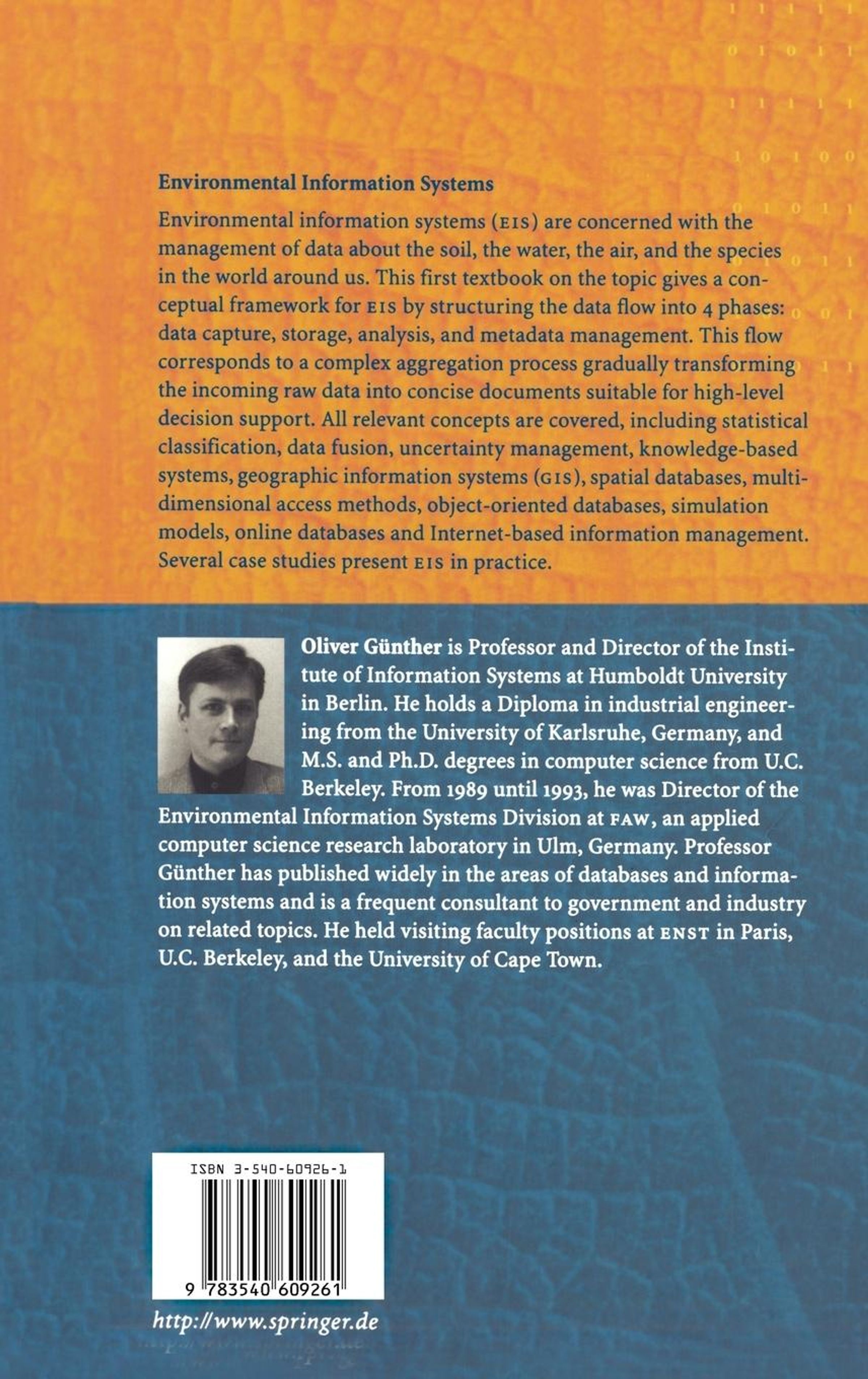 Environmental information systems (EIS) are concerned with the management of data about the soil, the water, the air, and the species in the world around us. This first textbook on the topic gives a conceptual framework for EIS by structuring the data flow into 4 phases: data capture, storage, analysis, and metadata management. This flow corresponds to a complex aggregation process gradually transforming the incoming raw data into concise documents suitable for high-level decision support. All relevant concepts are covered, including statistical classification, data fusion, uncertainty management, knowledge based systems, GIS, spatial databases, multidimensional access methods, object-oriented databases, simulation models, and Internet-based information management. Several case studies present EIS in practice.