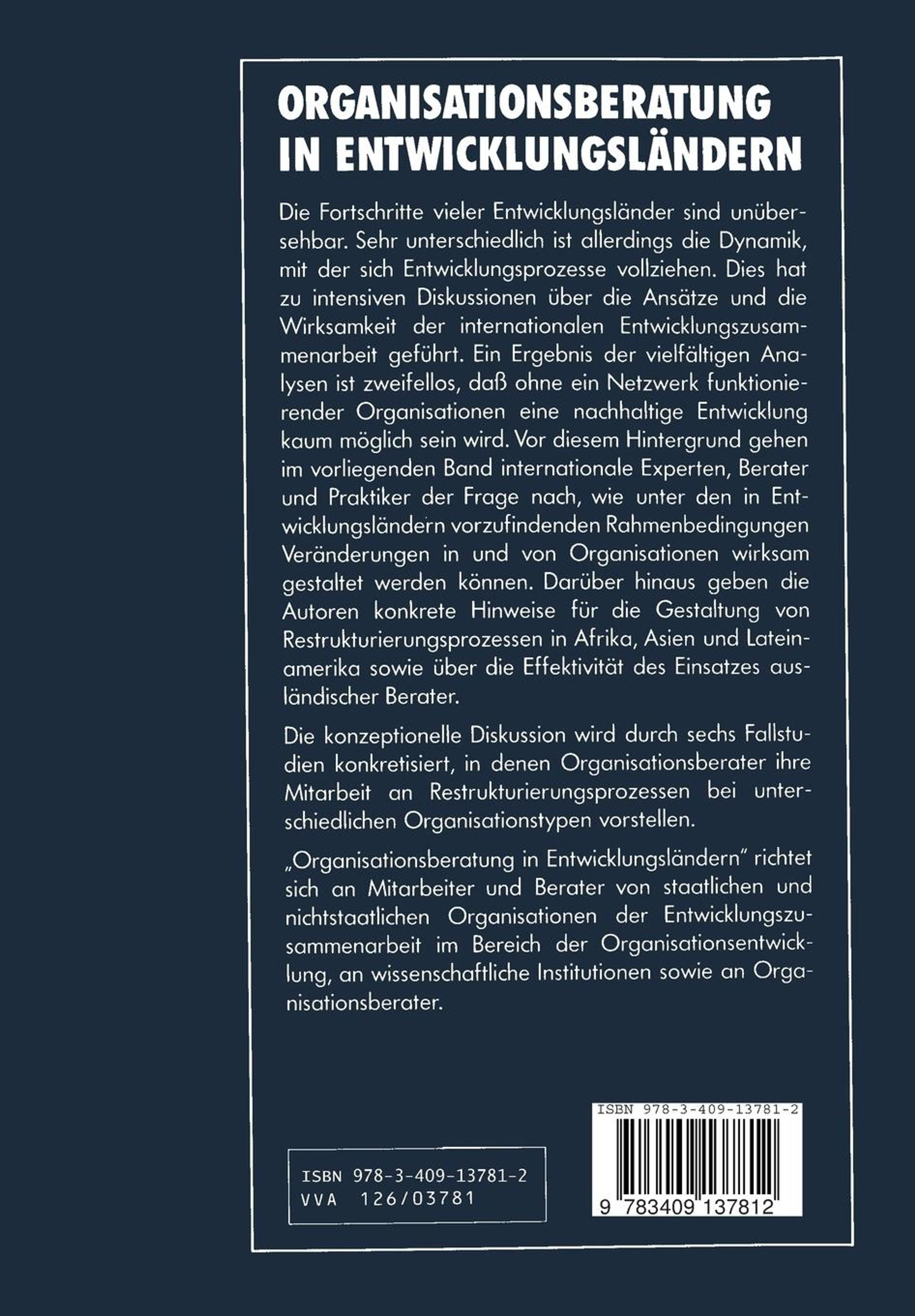 I: Konzepte.- 1 Peter L. Fedon.- Alte Verhältnisse in neuen Projekten? Zur Konzeption von Beratung in Projekten der Internationalen Zusammenarbeit.- 2 Karl-Heinz Hasenritter.- Ansätze der Weltbank zum Institutional Development eine kritische Würdigung.- 3 Peter Blunt.- Die kulturellen Grenzen der prozeßbegleitenden Beratung in der Entwicklungszusammenarbeit.- 4 Rabindra N. Kanungo, Manuel Mendonça.- Personalmanagement in Entwicklungsländern: Bedeutung für die Managementberatung.- 5 Moses N. Kiggundu, Bernard Z. Dasah.- Professionelle Effektivität ausländischer Berater in Entwicklungsländern.- 6 Rolf-Dieter Reineke.- Beraterethik im internationalen Kontext.- II: Fallstudien.- 7 Arthur Zimmermann.- Intermittierende Prozeßberatung für eine Nichtregierungs-organisation Fallbeispiel Westafrika.- 8 Rainer Müller-Glodde.- Prozeßberatung in Unternehmensverbänden Fallbeispiel Brasilien.- 9 Hans Walker.- Von der Fachberatung zur Prozeßberatung in einem Landwirtschaftsministerium Fallbeispiel Simbabwe.- 10 Hejo Heussen.- Transparenz, Rollenkonflikte und Abbruch der Beratung in Prozessen der Organisationsentwicklung Fallbeispiel Ost-Karibik.- 11 Renata Kiefer.- Organisationsentwicklung eines Forschungsinstituts durch Personalentwicklung Fallbeispiel Paraguay.- 12 Martin Harder.- Organisationsentwicklung in einer Selbsthilfeorganisation über interne OE-Ausbildung Fallbeispiel Westafrika.