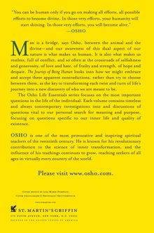Man is a bridge, says Osho, between the animal and the divine-and our awareness of this dual aspect of our nature is what makes us human. It is also what makes us restless, full of conflict, so often at the crossroads of selfishness and generosity, of love and hate, frailty and strength, hope and despair.