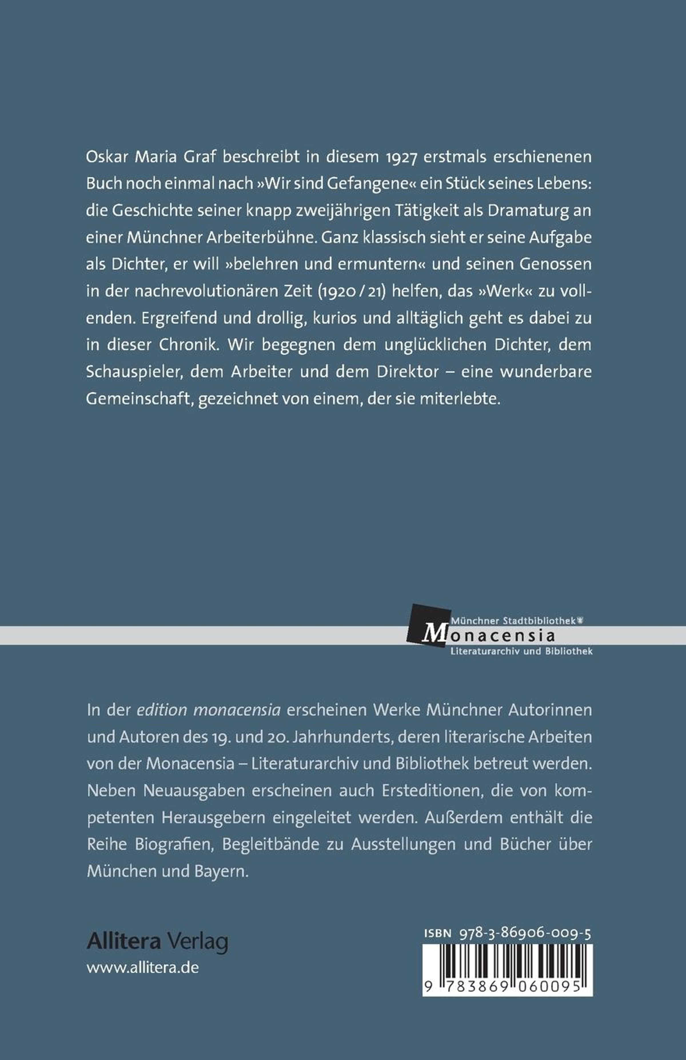 Oskar Maria Graf beschreibt in diesem 1927 erstmals erschienenen Buch noch einmal nach >>Wir sind Gefangene<< ein Stück seines Lebens: die Geschichte seiner knapp zweijährigen Tätigkeit als Dramaturg an einer Münchner Arbeiterbühne. Ganz klassisch sieht er seine Aufgabe als Dichter, er will >>belehren und ermuntern<< und seinen Genossen in der nachrevolutionären Zeit (1920 / 21) helfen, das >>Werk<< zu vollenden. Ergreifend und drollig, kurios und alltäglich geht es dabei zu in dieser Chronik. Wir begegnen dem unglücklichen Dichter, dem Schauspieler, dem Arbeiter und dem Direktor ¿ eine wunderbare Gemeinschaft, gezeichnet von einem, der sie miterlebte.