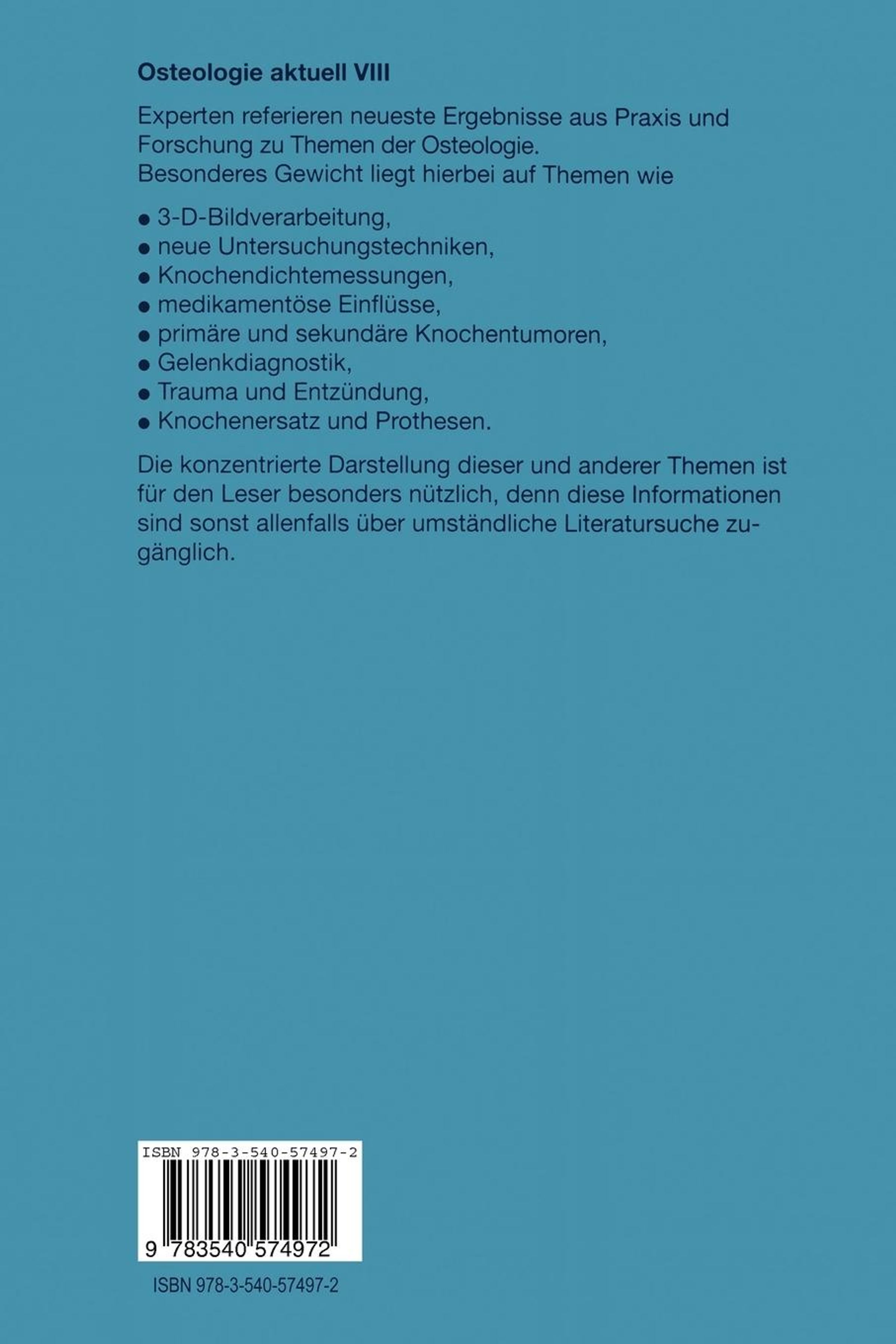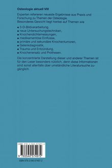 Neueste Ergebnisse aus Praxis und Forschung zu Themen der Osteologie werden von Experten referiert. Besonderes Gewicht liegt hierbei auf Themen wie Primäre und sekundäre Knochentumoren, Medikamentöse Einflüsse auf das Skelettsystem, Gelenkdiagnostik, Trauma-Entzündung, Knochenersatz und Prothesen. Die konzentrierte Darstellung dieser und anderer Themen ist für den Leser besonders nützlich, dem diese Informationen sonst allenfalls über umständliche Literatursuche zugänglich ist.