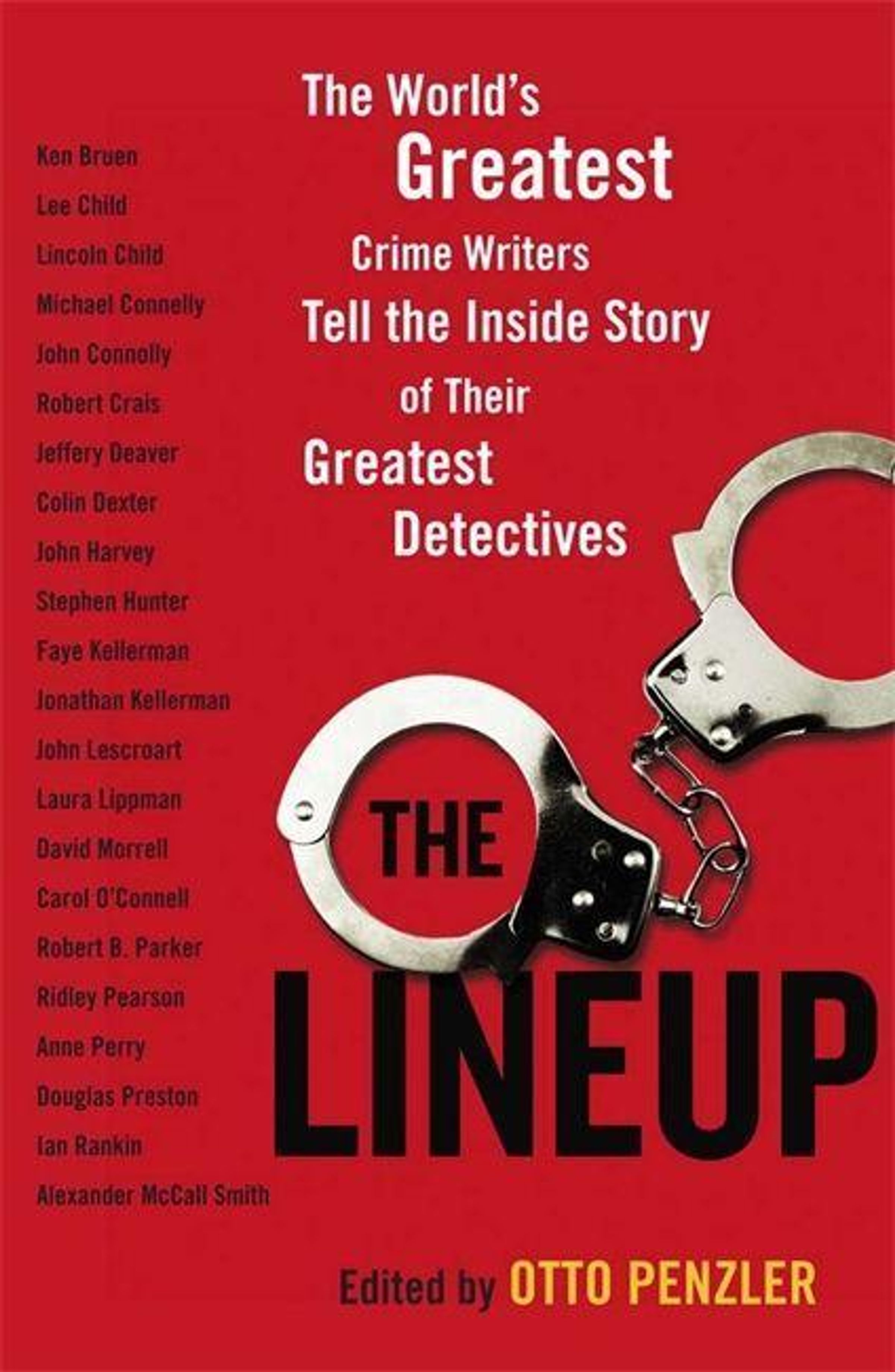 "The World’s Greatest Crime Writers Tell the Inside Story of Their Greatest Detectives. THE LINEUP. Edited by Otto Penzler." Oben links Namen bekannter Autoren, rechts ein Paar Handschellen., Buch