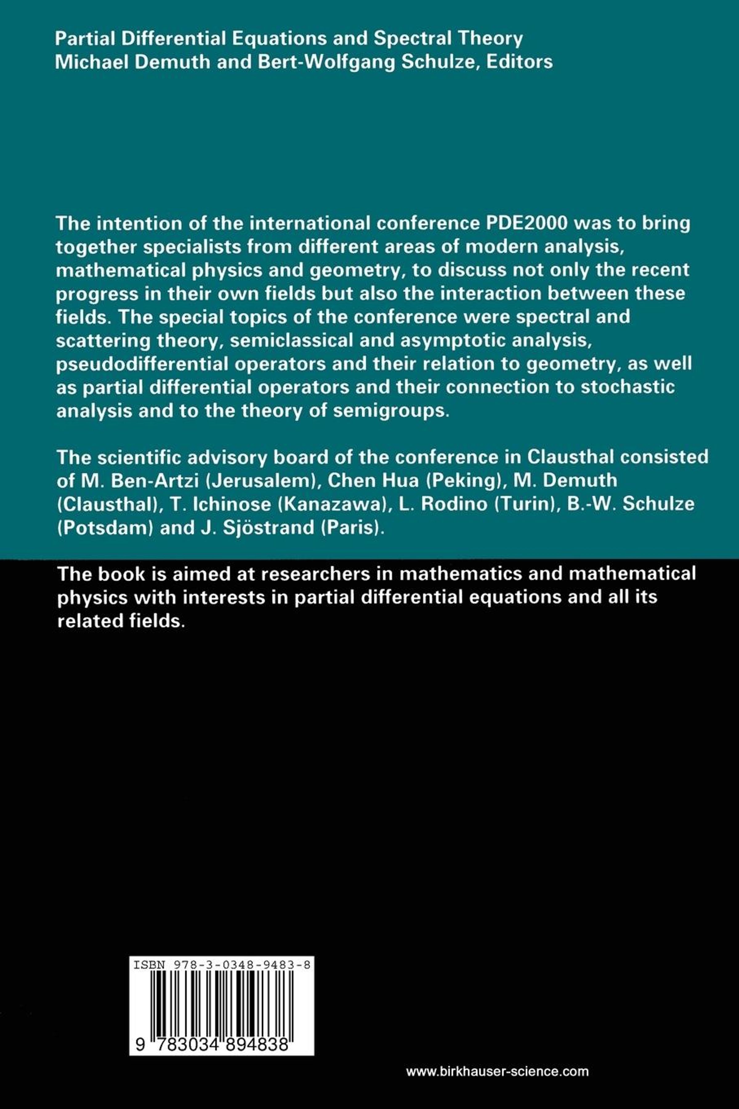 This volume contains the proceedings of "PDE 2000", the international conference on partial differential equations held July 24 -28, 2000, in Clausthal. The confer ence took place during the EXPO 2000 and was sponsored by the Land Nieder sachsen, the Deutsche Forschungsgemeinschaft, the Bergstadt Clausthal-Zellerfeld and the Kreissparkasse Clausthal-Zellerfeld. This conference continues a series: Ludwigfelde 1976, Reinhardsbrunn 1985, Holz hau 1988, Breitenbrunn 1990, Lambrecht 1991 (proceedings in Operator Theory: Advances and Applications, Vol. 57, Birkhauser Verlag 1992), Potsdam 1992 and 1993, Holzhau 1994 (proceedings in Operator Theory: Advances and Applications, Vol. 78, Birkhauser Verlag 1995), Caputh 1995 and Potsdam 1996 (proceedings in Mathematical Research, Vol. 100, Akademie Verlag 1997). The intention of the organizers was to bring together specialists from different areas of modern analysis, mathematical physics and geometry, to discuss not only the recent progress in their own fields but also the interaction between these fields. The special topics of the conference were spectral and scattering theory, semiclas sical and asymptotic analysis, pseudodifferential operators and their relation to geometry, as well as partial differential operators and their connection to stochas tic analysis and to the theory of semigroups. The scientific advisory board of the conference in Clausthal consisted of M. Ben Artzi (Jerusalem), Chen Hua (Peking), M. Demuth (Clausthal), T. Ichinose (Kanazawa), 1. Rodino (Thrin), B.-W. Schulze (Potsdam) and J. Sjostrand (Paris).