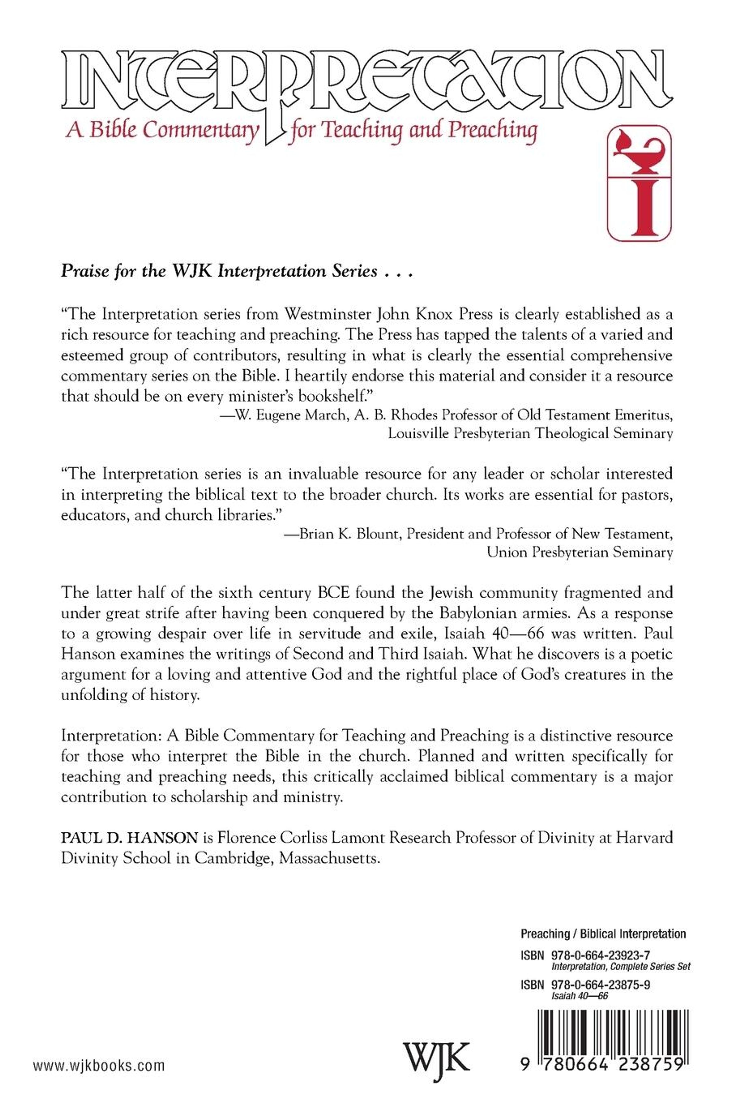The latter half of the sixth century BCE found the Jewish community fragmented and under great strife after having been conquered by the Babylonian armies. As a response to a growing despair over life in servitude and exile, Isaiah 40-66 was written. Paul Hanson examines the writings of Second and Third Isaiah. What he discovers is a poetic argument for a loving and attentive God and the rightful place of God's creatures in the unfolding of history.