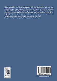 Nach Beendigung der lang anhaltenden Zeit der Bürgerkriege galt es, die Staatsverfassung neu zu ordnen und den Frieden zu sichern. Zur Schaffung gewisser gesellschaftlicher Grundlagen erließ Augustus eine Reihe von Ehegesetzen, mit den sich Paul Jörs hier detailliert auseinandersetzt und ihre einzelnen Bestandteile erläutert. Sorgfältig bearbeiteter Nachdruck der Originalausgabe von 1894.