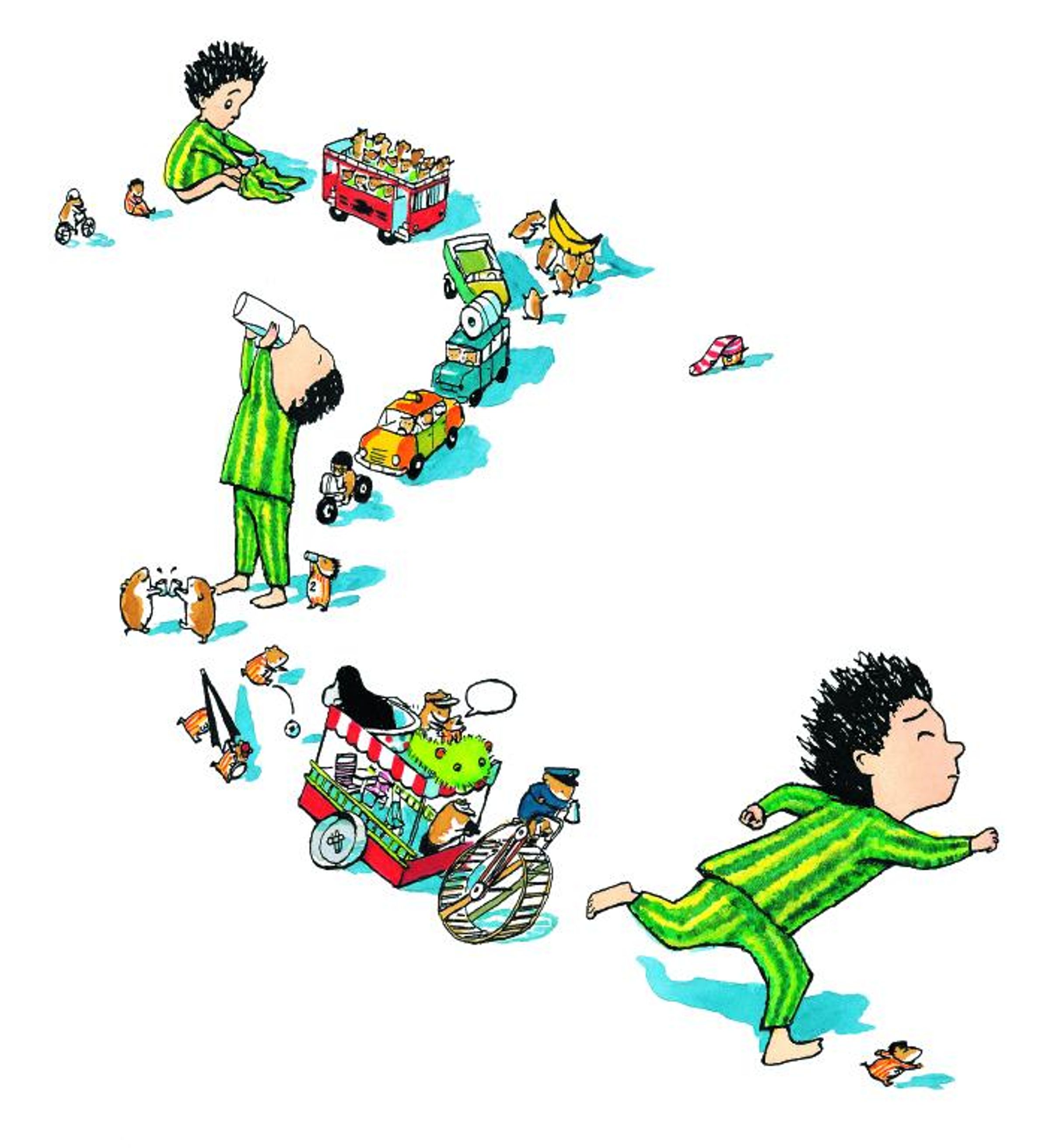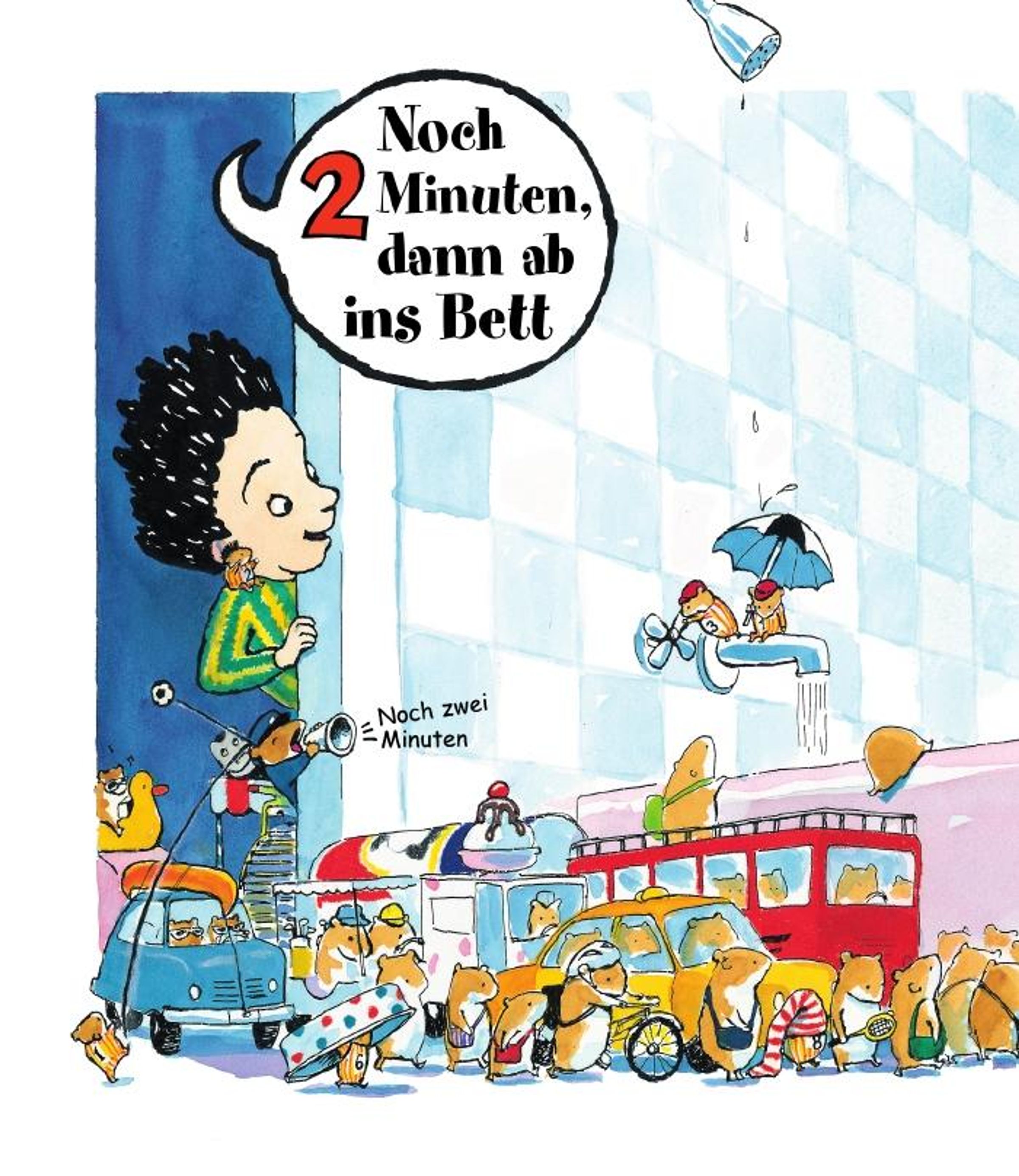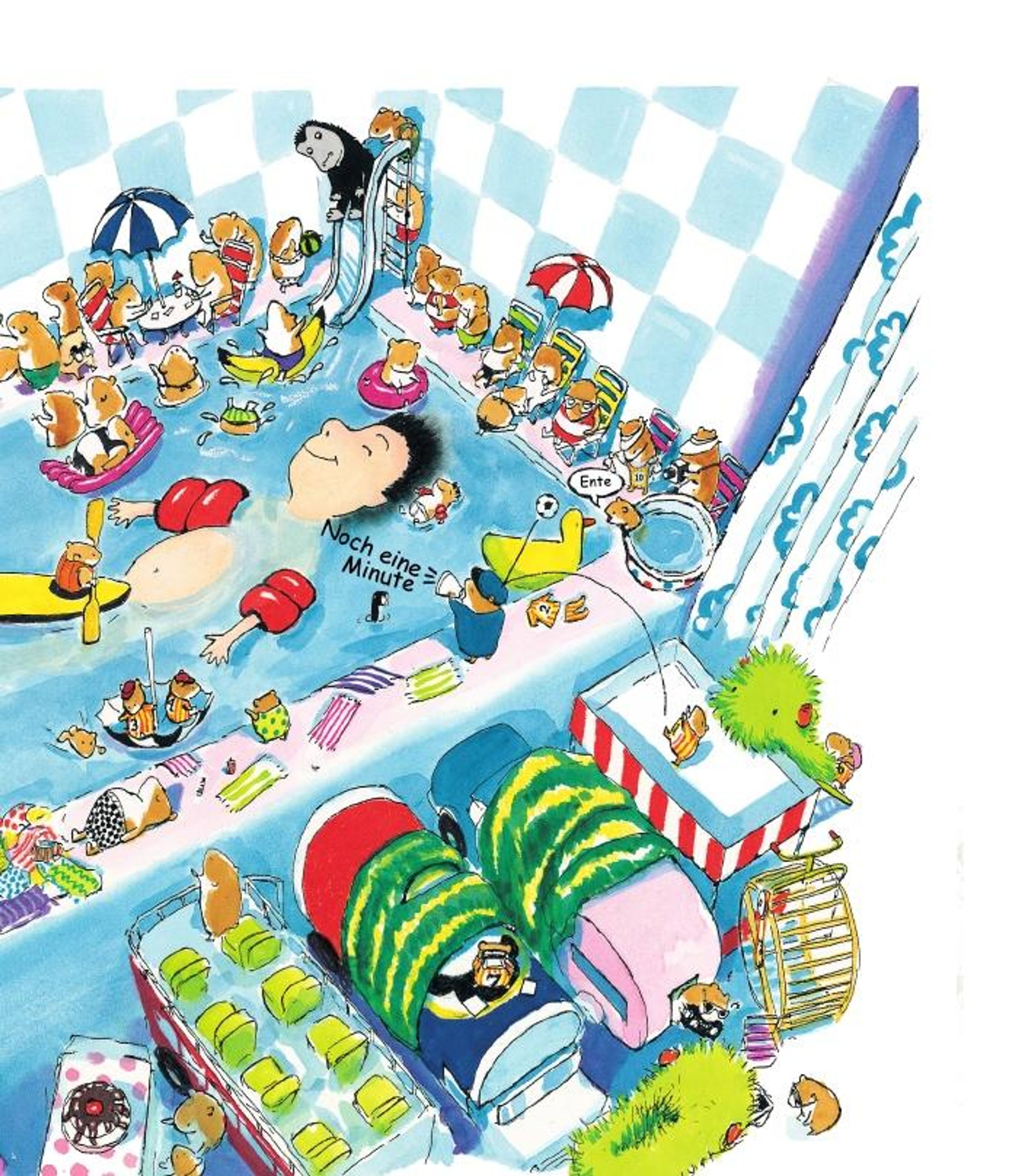 Noch 10 Minuten, dann ab ins Bett! Aber in 10 Minuten kann viel passieren. Besonders, wenn sich die Hamster-Tours angesagt haben und genau in diesem Augenblick mit Bussen, Wohnwagen und anderen Gefährten zur Tür hereinkommen. Unzählige Hamster lassen es sich in ihren Ferien richtig gut gehen. Das Kind, das gleich ins Bett muss, kommt aus dem Staunen nicht heraus. Und der Leser auch nicht, denn es gibt einfach unendlich viel zu entdecken auf diesen wimmeligen Seiten. In einem unglaublichen Endspurt schafft es das Kind rechtzeitig ins Bett und schläft müde und glücklich ein, während die vielen Hamster vergnügt wieder nach Hause fahren.