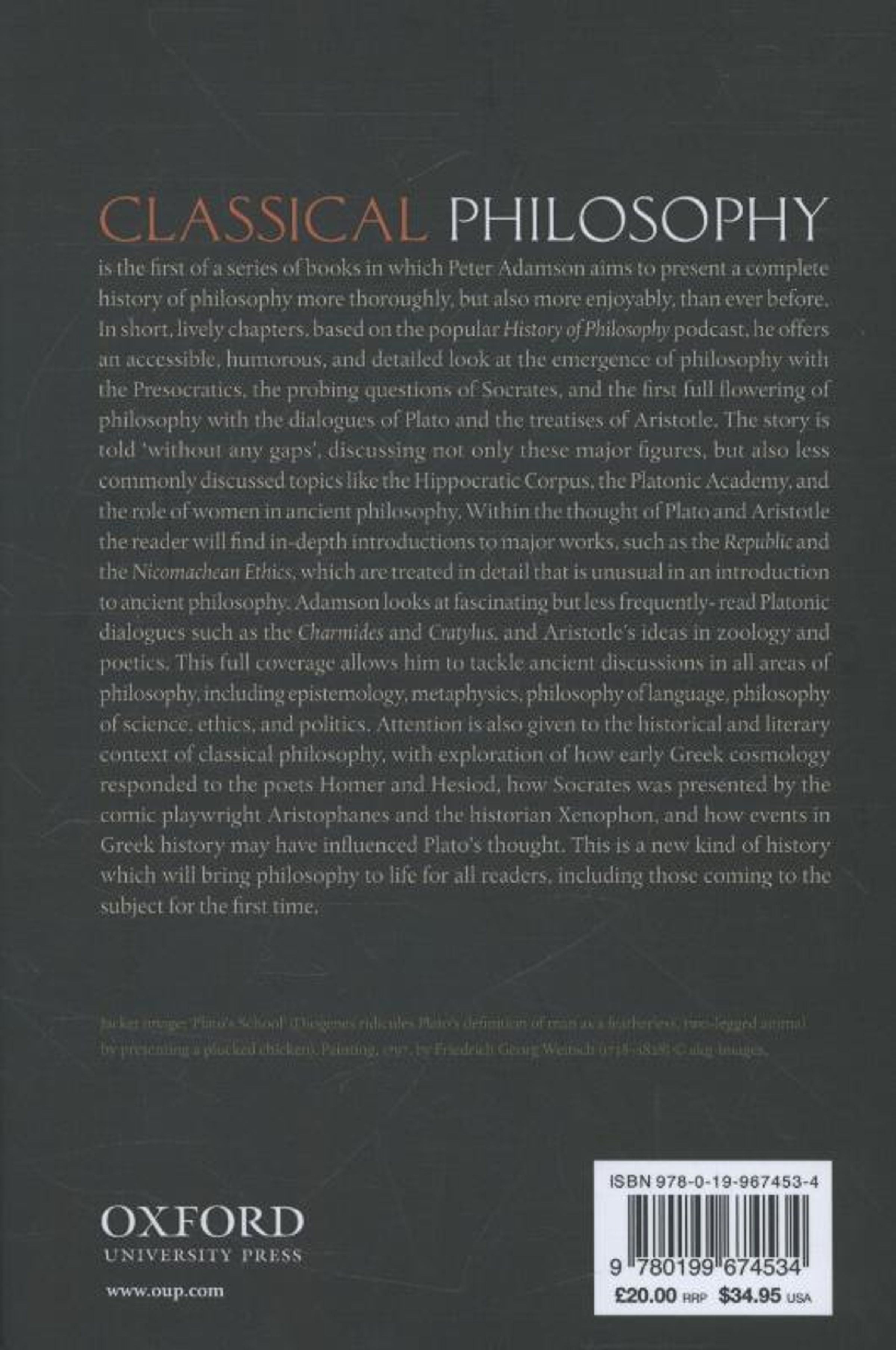 Classical Philosophy is the first of a series of books in which Peter Adamson aims ultimately to present a complete history of philosophy, more thoroughly but also more enjoyably than ever before. In short, lively chapters, based on the popular History of Philosophy podcast, he offers an accessible, humorous, and detailed look at the emergence of philosophy with the Presocratics, the probing questions of Socrates, and the first full flowering of philosophy with the dialogues of Plato and the treatises of Aristotle. The story is told 'without any gaps', discussing not only such major figures but also less commonly discussed topics like the Hippocratic Corpus, the Platonic Academy, and the role of women in ancient philosophy. Within the thought of Plato and Aristotle, the reader will find in-depth introductions to major works, such as the Republic and the Nicomachean Ethics , which are treated in detail that is unusual in an introduction to ancient philosophy. Adamson looks at fascinating but less frequently read Platonic dialogues like the Charmides and Cratylus, and Aristotle's ideas in zoology and poetics. This full coverage allows him to tackle ancient discussions in all areas of philosophy, including epistemology, metaphysics, philosophy of language, philosophy of science, ethics and politics. Attention is also given to the historical and literary context of classical philosophy, with exploration of how early Greek cosmology responded to the poets Homer and Hesiod, how Socrates was presented by the comic playwright Aristophanes and the historian Xenophon, and how events in Greek history may have influenced Plato's thought. This is a new kind of history which will bring philosophy to life for all readers, including those coming to the subject for the first time.