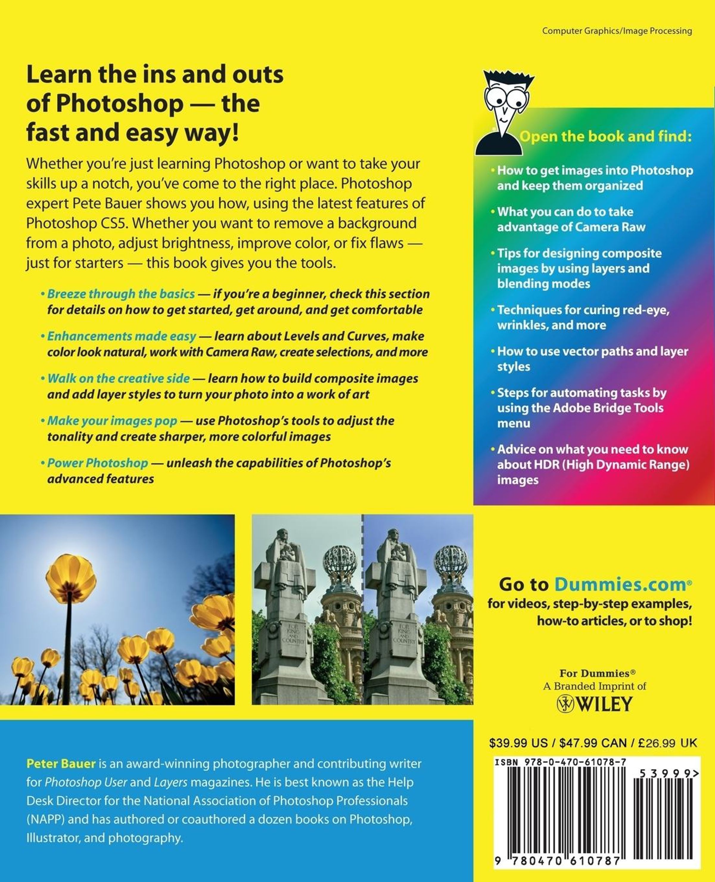 Whether you're just learning Photoshop or want to take your skills up a notch, you've come to the right place. Photoshop expert Pete Bauer shows you how, using the latest features of Photoshop CS5. Whether you want to remove a background from a photo, adjust brightness, improve color, or fix flaws ? just for starters ? this book gives you the tools.