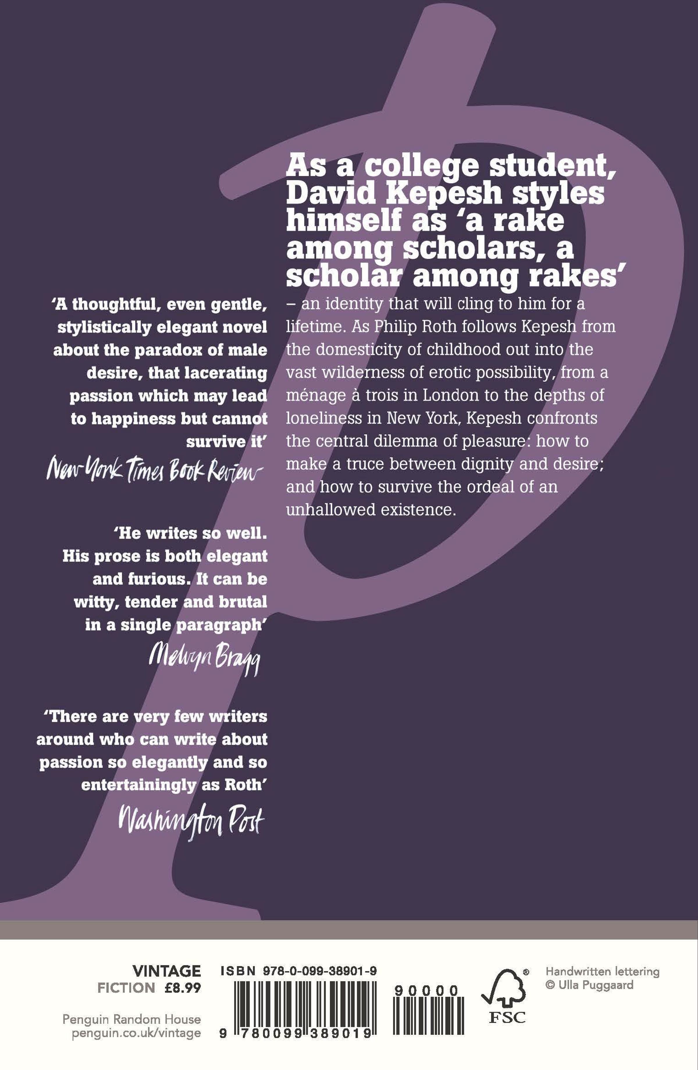 As a student in college, David Kepesh styles himself as 'a rake among scholars, a scholar among rakes' - an identity that will cling to him for a lifetime. As Philip Roth follows Kapesh from the domesticity of childhood out into the vast wilderness of erotic possibility, from a ménage à trois in London to the depths of loneliness in New York, Kapesh confronts the central dilemma of pleasure: how to make a truce between dignity and desire; and how to survive the ordeal of an unhallowed existence.