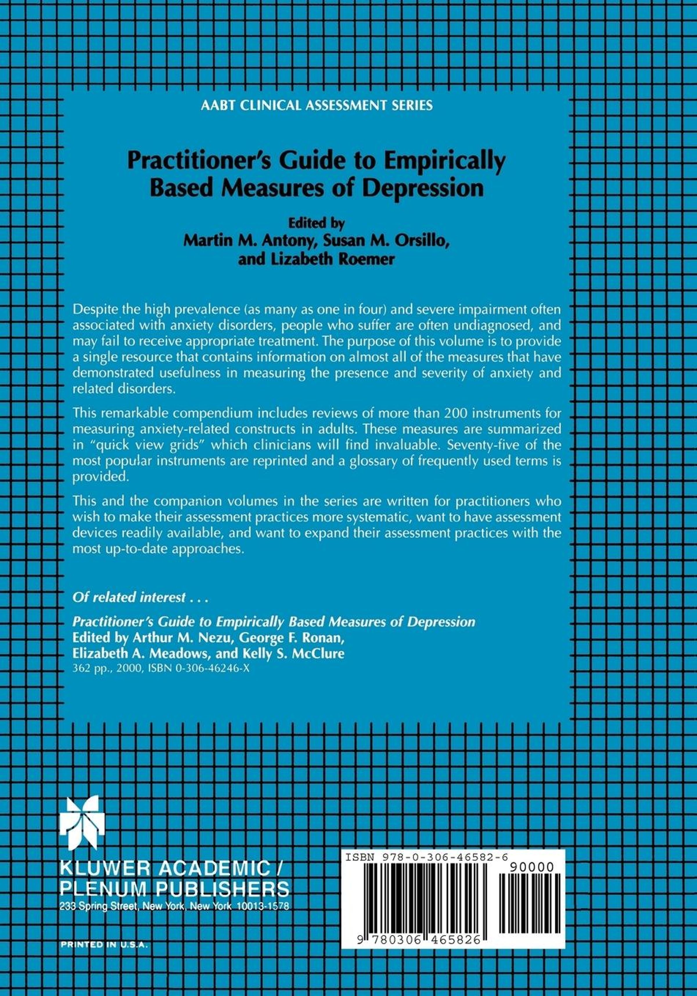 Despite the high prevalence (as many as one in four) and severe impairment often associated with anxiety disorders, people who suffer are often undiagnosed, and may fail to receive appropriate treatment. The purpose of this volume is to provide a single resource that contains information on almost all of the measures that have demonstrated usefulness in measuring the presence and severity of anxiety and related disorders. This remarkable compendium includes reviews of more than 200 instruments for measuring anxiety-related constructs in adults. These measures are summarized in `quick view grids' which clinicians will find invaluable. Seventy-five of the most popular instruments are reprinted and a glossary of frequently used terms is provided. This and the companion volumes in the series are written for practitioners who wish to make their assessment practices more systematic, want to have assessment devices readily available, and want to expand their assessment practices with the most up-to-date approaches.