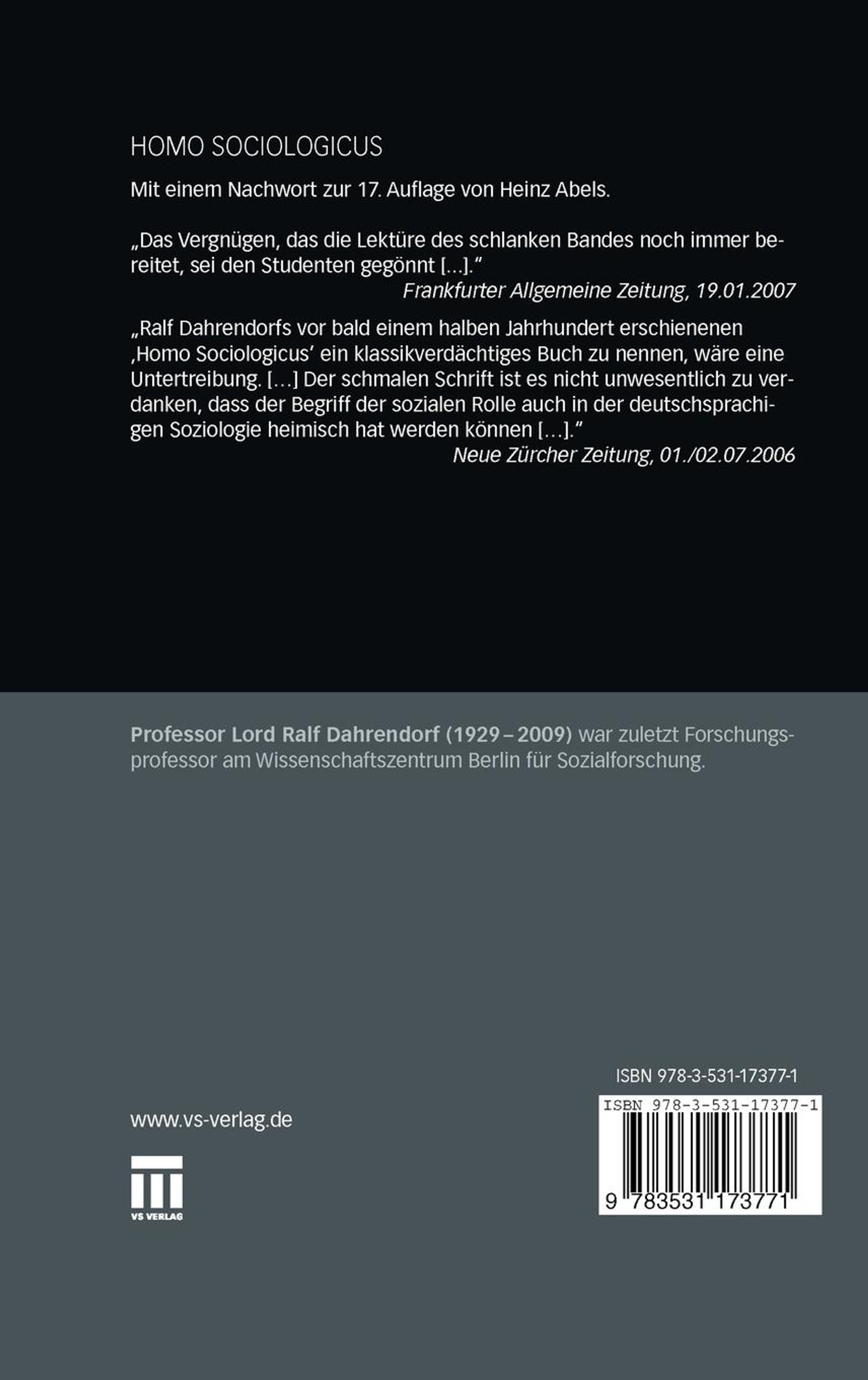 "Ralf Dahrendorfs vor bald einem halben Jahrhundert erschienenen ,Homo Sociologicus' ein klassikverdächtiges Buch zu nennen, wäre eine Untertreibung. [...] Der schmalen Schrift ist es nicht unwesentlich zu verdanken, dass der Begriff der sozialen Rolle auch in der deutschsprachigen Soziologie heimisch hat werden können [...]." Neue Zürcher Zeitung, 1./2.7.2006