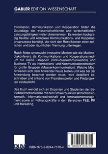 Information, Kommunikation und Kooperation bilden die Grundlage der wissenschaftlichen und wirtschaftlichen Leistungsfähigkeit vieler Unternehmen. Es werden hochgradig flexible und komplexe Kommunikations- und Kooperationsprozesse benötigt, die nicht den Restriktionen einer zeitlichen und / oder räumlichen Trennung unterliegen. Ralph Nebe untersucht innovative Medien wie die Multimediakonferenz als Kommunikations- und Kooperationsmedium für kleine Gruppen (Individualkommunikation) und Business-TV als Informations- und Kommunikationsmedium für große Gruppen (Massenkommunikation). Welche Möglichkeiten sich dem Anwender heute bieten und was bei der Anwendung beachtet werden muss, wird detailliert beschrieben und anhand von Praxisbeispielen und Pilotprojekten verdeutlicht.