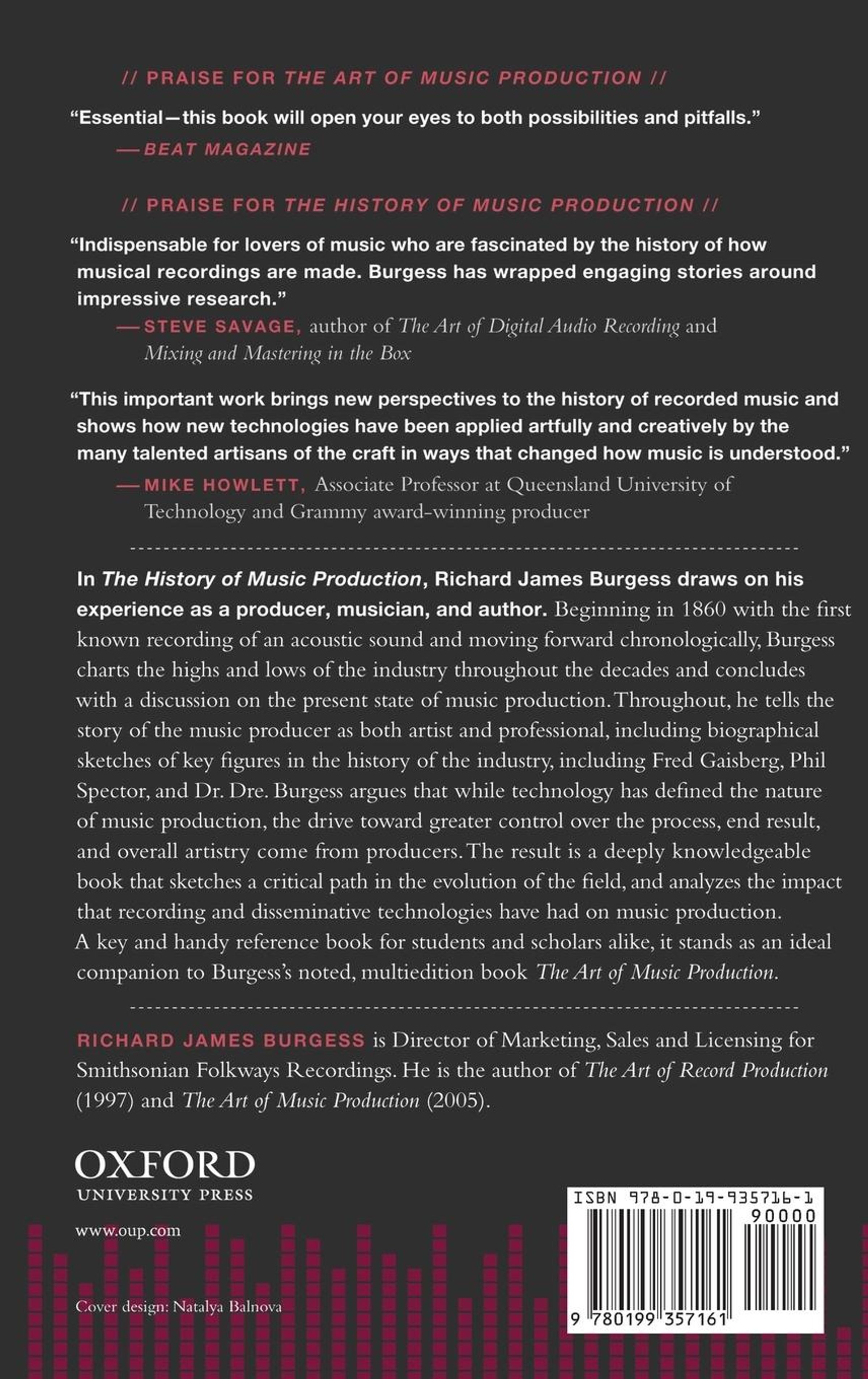 Richard James Burgess draws on his experience as a producer, a musician, and an author in this history of recorded music, which focuses on the development of music production as both art form and profession. This comprehensive narrative begins in 1860 with the first known recording of an acoustic sound and moves chronologically through the twentieth century, examining the creation of the market for recorded sound, the development of payment structures, the origins of the recording studio and those who work there, and, ultimately, the evolution of the recording industry itself. Burgess charts the highs and lows of the industry through the decades, ending with a discussion of how Web 2.0 has affected music production. The focus remains throughout the book on the role of the music producer, and Burgess offers biographical information on key figures in the history of the industry, including Fred Gaisberg, Phil Spector, and Dr. Dre.
