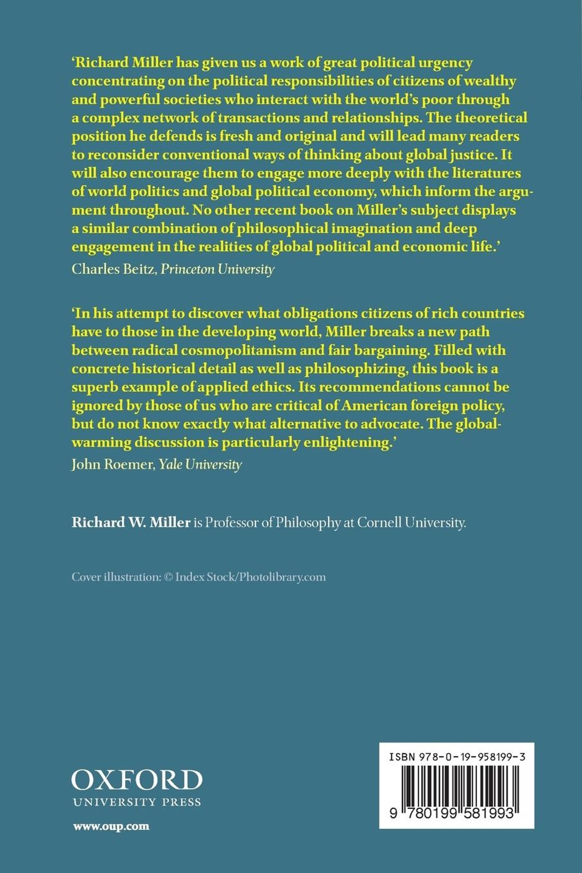 Combining deep moral argument with extensive factual inquiry, Richard Miller constructs a new account of international justice. Though a critic of demanding principles of kindness toward the global poor and an advocate of special concern for compatriots, he argues for standards of responsible conduct in transnational relations that create vast unmet obligations. Governments, firms and people in developed countries, above all, the United States, by failing to live up to these responsibilities, take advantage of people in developing countries.