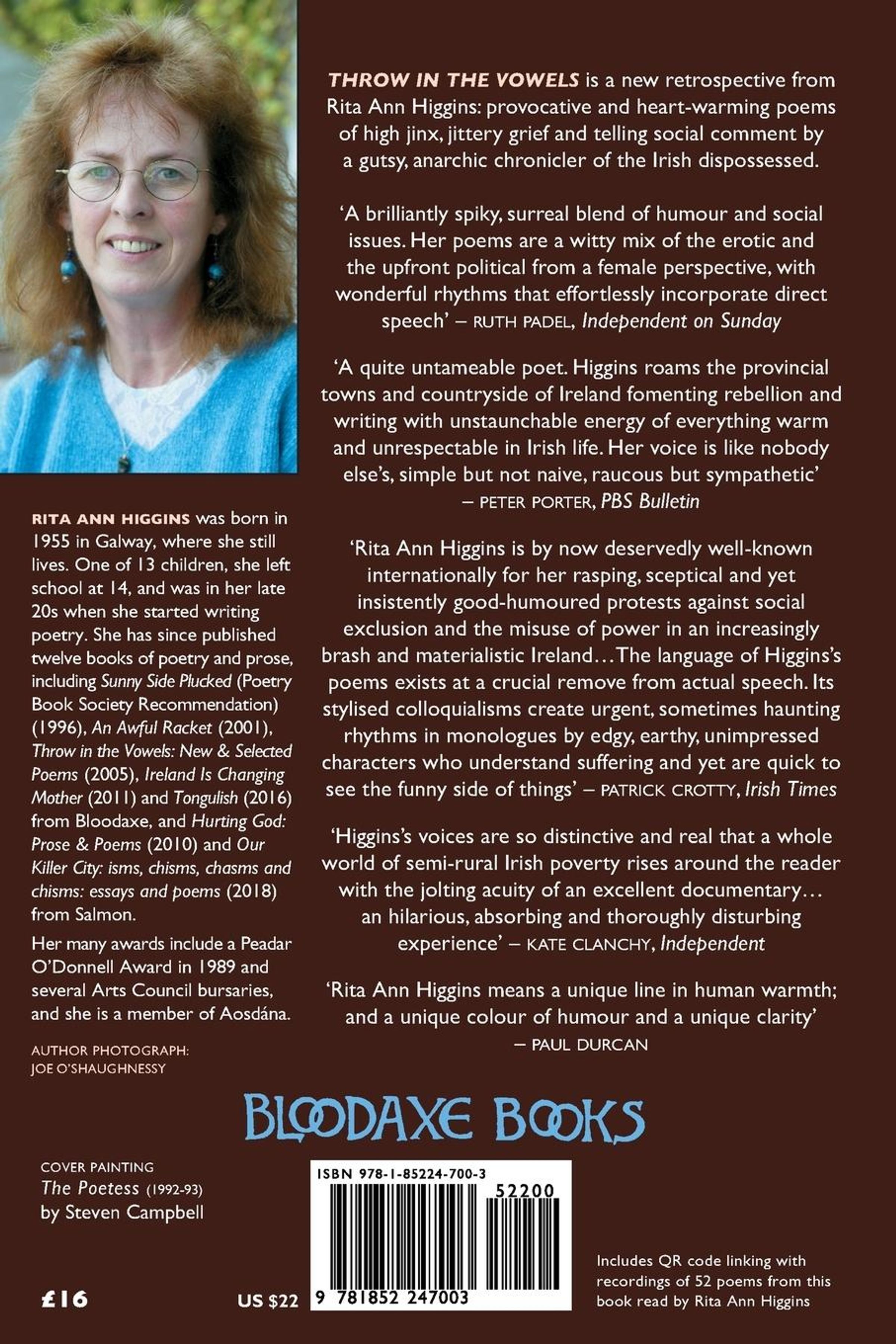 Throw in the Vowels is a new retrospective from Rita Ann Higgins: provocative and heart-warming poems of high jinks, jittery grief and telling social comment by a gutsy, anarchic chronicler of the Irish dispossessed. The 2010 reissue of this title includes a free audio CD of poems read by the author. She has since published two later collections, Ireland Is Changing Mother (2011) and Tongulish (2016).
