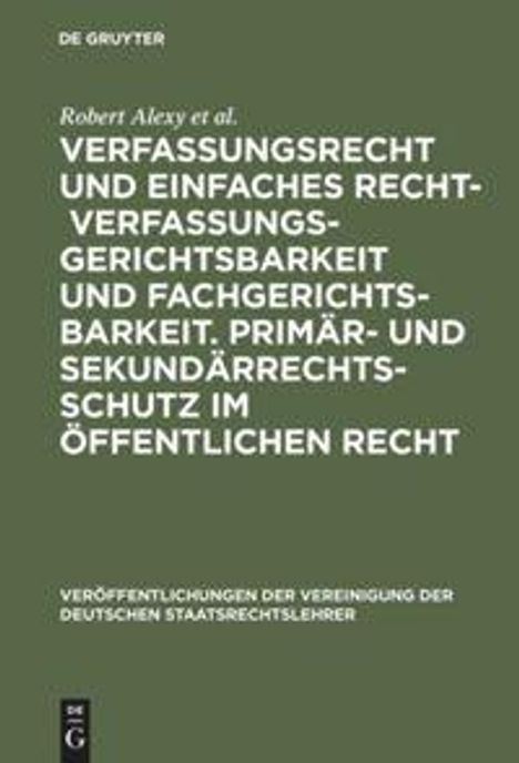 Frontmatter -- Inhalt -- Jahrestagung 2001 -- Erster Beratungsgegenstand: Verfassungsrecht und einfaches Recht - Verfassungsgerichtsbarkeit und Fachgerichtsbarkeit -- 1. Bericht von Prof. Dr. Robert Alexy, Kiel -- 2. Bericht von Prof. Dr. Philip Kunig, Berlin -- 3. Bericht von Prof. Dr. Werner Heun, Göttingen -- 4. Bericht von Prof. Dr. Georg Hermes, Frankfurt am Main -- 5. Aussprache und Schlussworte -- Zweiter Beratungsgegenstand: Primär- und Sekundärrechtsschutz im Öffentlichen Recht -- 1. Bericht von Prof. Dr. Wilfried Erbguth, Rostock -- 2. Bericht von Prof. Dr. Wolfram Höfling, M. A., Köln -- 3. Bericht von Prof. Dr. Rudolf Streinz, Bayreuth -- 4. Bericht von Prof. Dr. Astrid Epiney, Freiburg (Schweiz) -- 5. Aussprache und Schlussworte -- Verzeichnis der Redner -- Verzeichnis der Mitglieder der Vereinigung der Deutschen Staatsrechtslehrer -- Satzung
