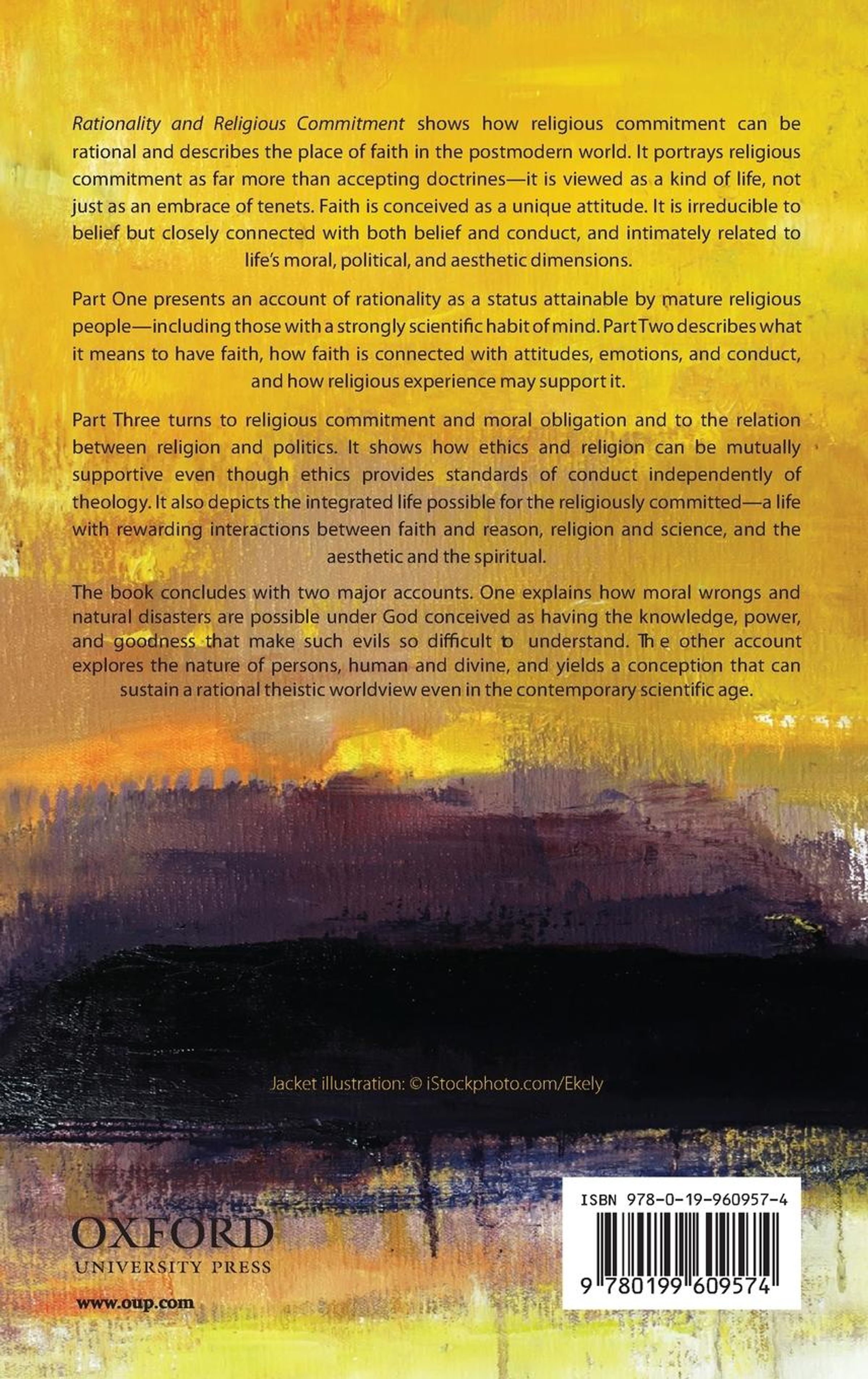 Rationality and Religious Commitment shows how religious commitment can be rational and describes the place of faith in the postmodern world. It portrays religious commitment as far more than accepting doctrines--it is viewed as a kind of life, not just as an embrace of tenets. Faith is conceived as a unique attitude. It is irreducible to belief but closely connected with both belief and conduct, and intimately related to life's moral, political, and aesthetic dimensions. Part One presents an account of rationality as a status attainable by mature religious people--even those with a strongly scientific habit of mind. Part Two describes what it means to have faith, how faith is connected with attitudes, emotions, and conduct, and how religious experience may support it. Part Three turns to religious commitment and moral obligation and to the relation between religion and politics. It shows how ethics and religion can be mutually supportive even though ethics provides standards of conduct independently of theology. It also depicts the integrated life possible for the religiously committed--a life with rewarding interactions between faith and reason, religion and science, and the aesthetic and the spiritual. The book concludes with two major accounts. One explains how moral wrongs and natural disasters are possible under God conceived as having the knowledge, power, and goodness that make such evils so difficult to understand. The other account explores the nature of persons, human and divine, and yields a conception that can sustain a rational theistic worldview even in the contemporary scientific age.