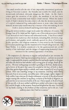 This small novella tells the tale of two impossibly intertwined gentlemen living in Victorian London---the friendly and sociable Dr Jekyll, and the monstrously deformed, obviously dangerous Mr Hyde. As Mr Hyde's crimes gain the attention of the police, the manhunt is on; but every lead on Hyde consistently leads back to Jekyll instead. When the darker truth of Hyde's identity becomes clear to all, that the monstrous predator of London's industrial-fog enshrouded streets is none other than Jekyll himself, transformed by a tincture of his own making, he sets forth to destroy himself and bring down Hyde with him.