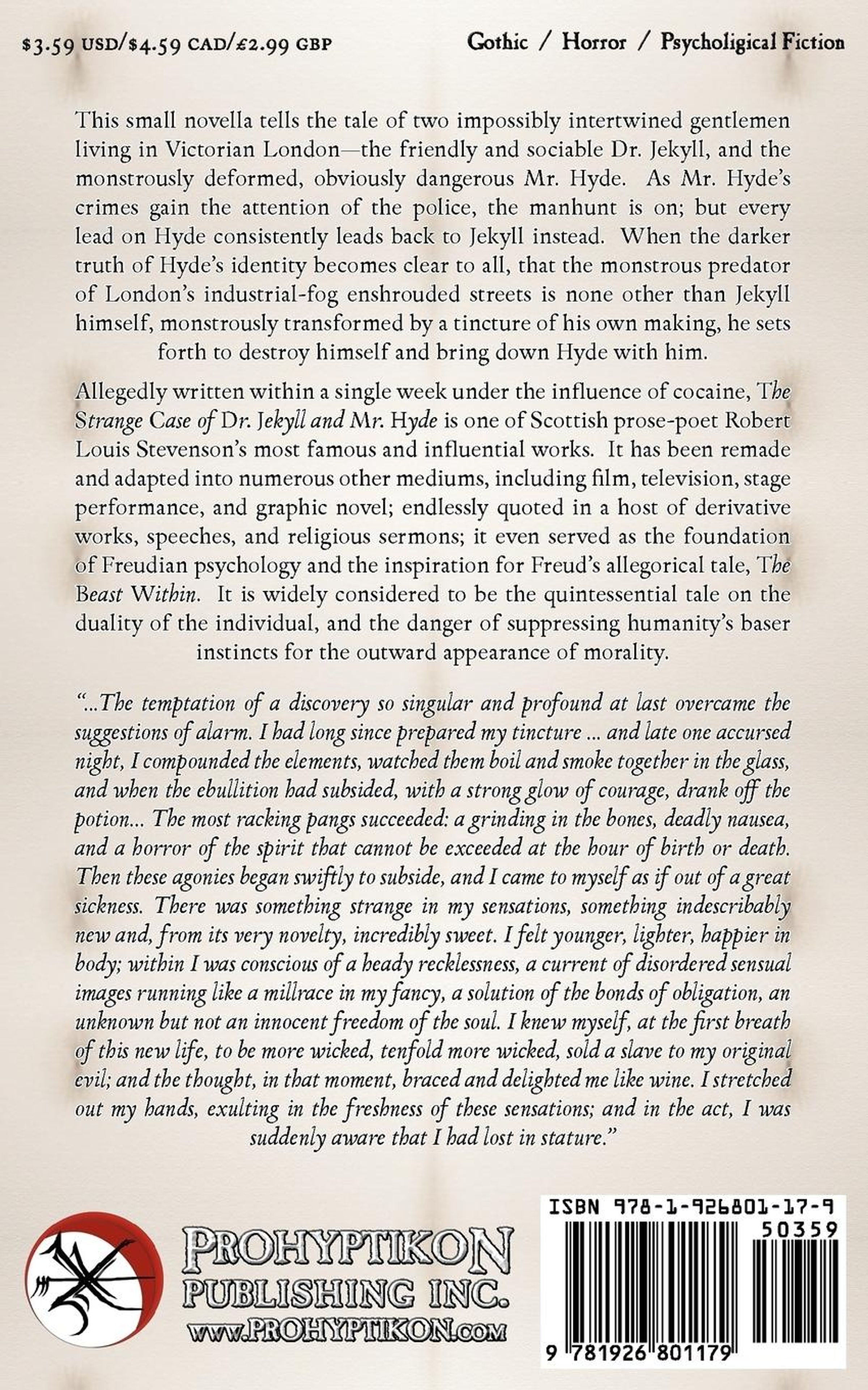 Allegedly written within a single week under the influence of cocaine, The Strange Case of Dr Jekyll and Mr Hyde is one of Scottish prose-poet Robert Louis Stevenson's most famous and influential works. It has been remade and adapted into numerous other mediums, including film, television, stage performance, and graphic novel; endlessly quoted in a host of derivative works, speeches, and religious sermons; it even served as the foundation of Freudian psychology and the inspiration for Freud's allegorical tale, The Beast Within. It is widely considered to be the quintessential tale on the duality of the individual, and the danger of suppressing humanity's baser instincts for the outward appearance of morality.