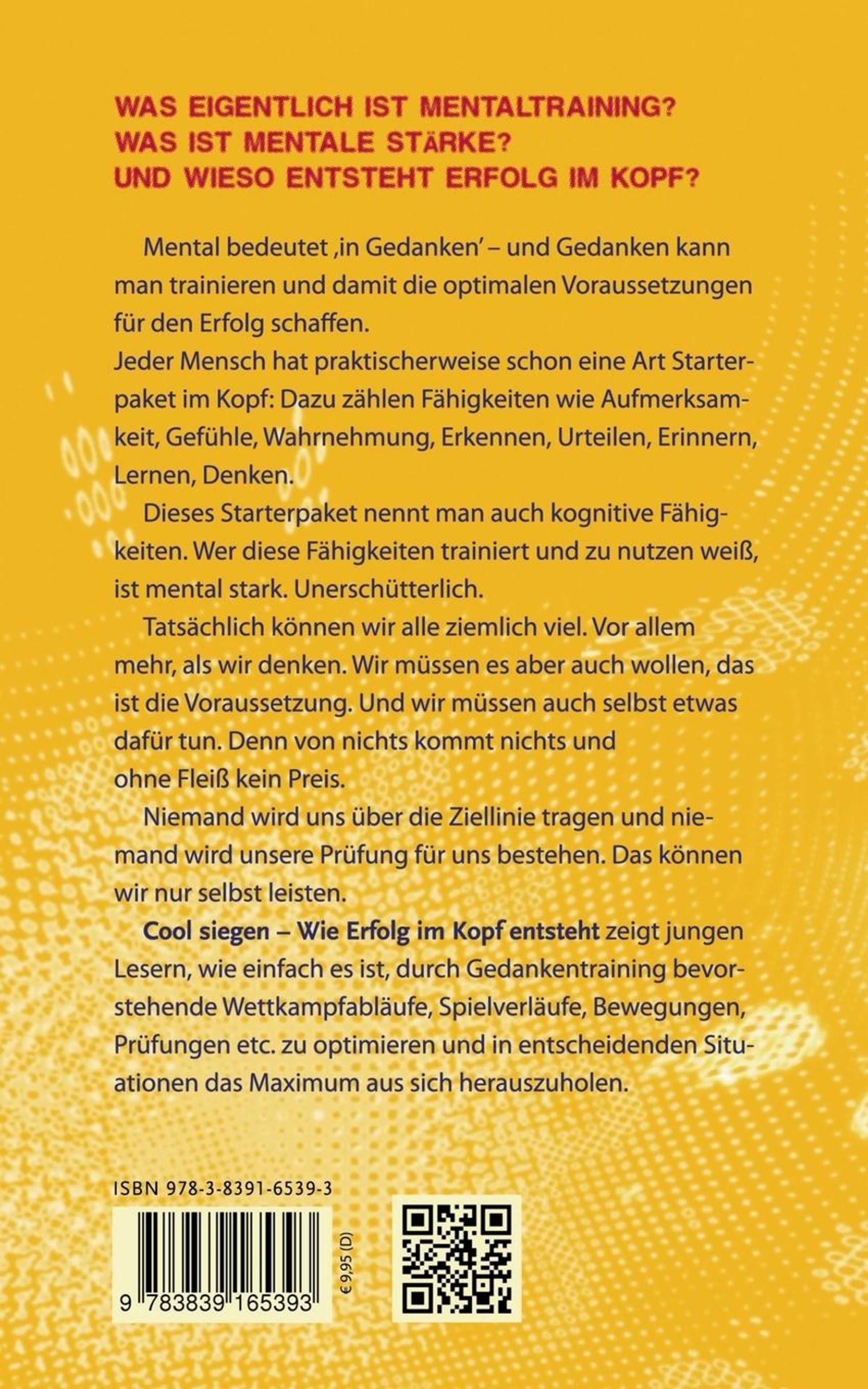 Was eigentlich ist Mentaltraining? Was ist mentale Stärke? Und wieso entsteht Erfolg im Kopf? Mental bedeutet in Gedanken und diese kann man auch trainieren und damit die optimalen Voraussetzungen für den Erfolg schaffen. Cool siegen - Wie Erfolg im Kopf entsteht'zeigt jungen Lesern, wie einfach es ist, durch Gedankentraining bevorstehende Wettkämpfe, Spielverläufe, Bewegungen, Prüfungen etc. zu optimieren und in entscheidenden Situationen das Maximum aus sich heraus zu holen.