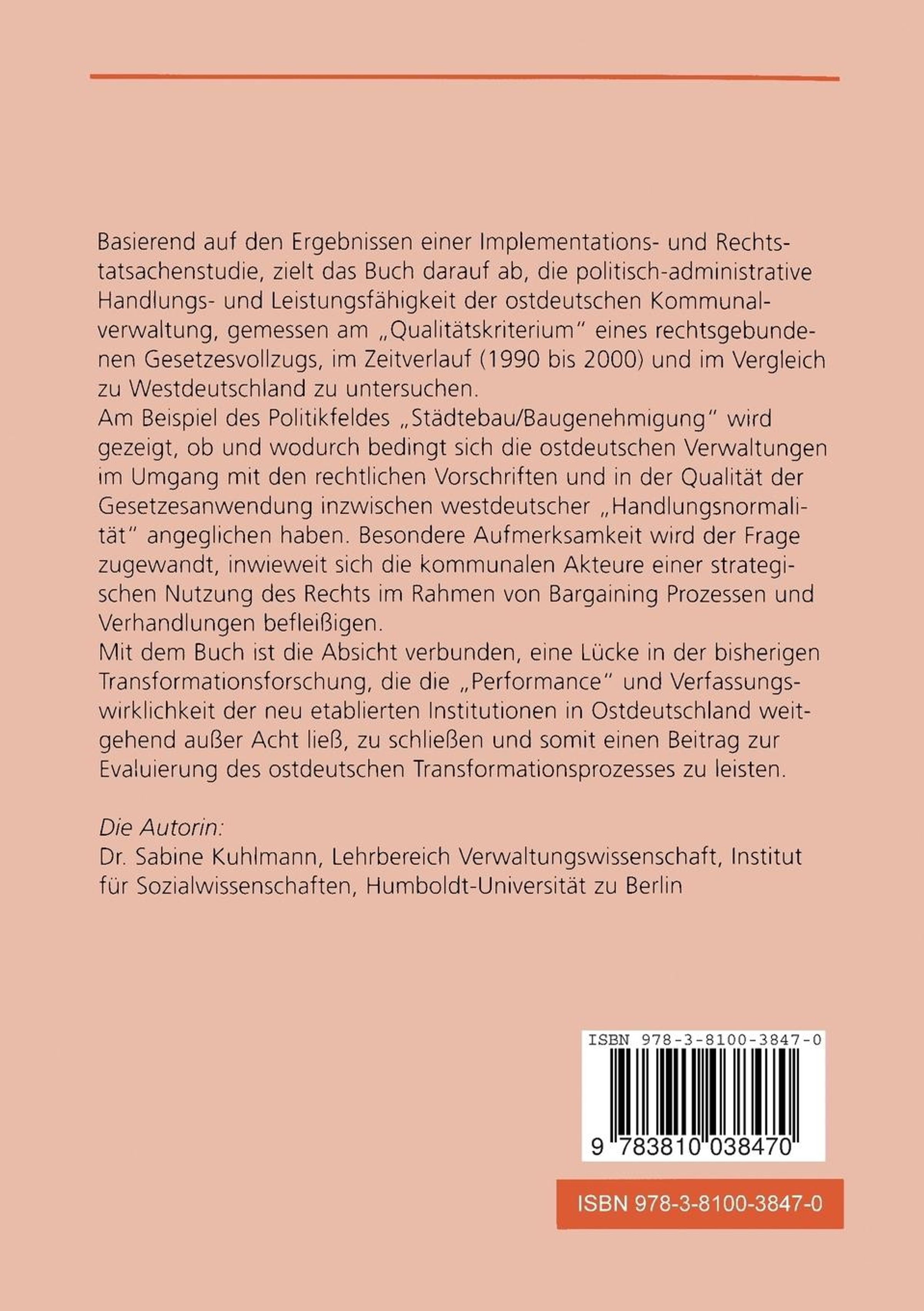 Basierend auf den Ergebnissen einer Implementations- und Rechtstatsachenstudie, zielt das Buch darauf ab, die politisch-administrative Handlungs- und Leistungsfähigkeit der ostdeutschen Kommunalverwaltung, gemessen am "Qualitätskriterium" eines rechtsgebundenen Gesetzesvollzugs, im Zeitverlauf (1990 bis 2000) und im Vergleich zu Westdeutschland zu untersuchen. Am Beispiel des Politikfeldes "Städtebau / Baugenehmigung" wird gezeigt, ob und wodurch bedingt sich die ostdeutschen Verwaltungen im Umgang mit den rechtlichen Vorschriften und in der Qualität der Gesetzesanwendung inzwischen westdeutscher "Handlungsnormalität" angeglichen haben. Besondere Aufmerksamkeit wird der Frage zugewandt, inwieweit sich die kommunalen Akteure einer strategischen Nutzung des Rechts im Rahmen von Bargaining Prozessen und Verhandlungen befleißigen. Mit dem Buch ist die Absicht verbunden, eine Lücke in der bisherigen Transformationsforschung, die die "Performance" und Verfassungswirklichkeit der neu etablierten Institutionen in Ostdeutschland weitgehend außer Acht ließ, zu schließen und somit einen Beitrag zur Evaluierung des ostdeutschen Transformationsprozesses zu leisten.