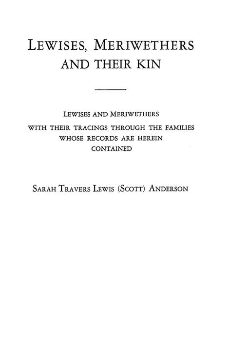Given the extent of the intermarriages between the Lewis family and the first families of Virginia, it is probable that this family has produced a greater proportion of eminent statesmen, soldiers, and frontiersmen than any family in America. Unlike Sorley's "Lewis of Warner Hall," Mrs. Anderson's book focuses attention on six Lewis families in America before 1740: the Warner Hall Lewises, of course; four John Lewises (of Hanover, Henrico, Donegal, and Shenandoah); and Zachary Lewis, the latter being an especially detailed history.