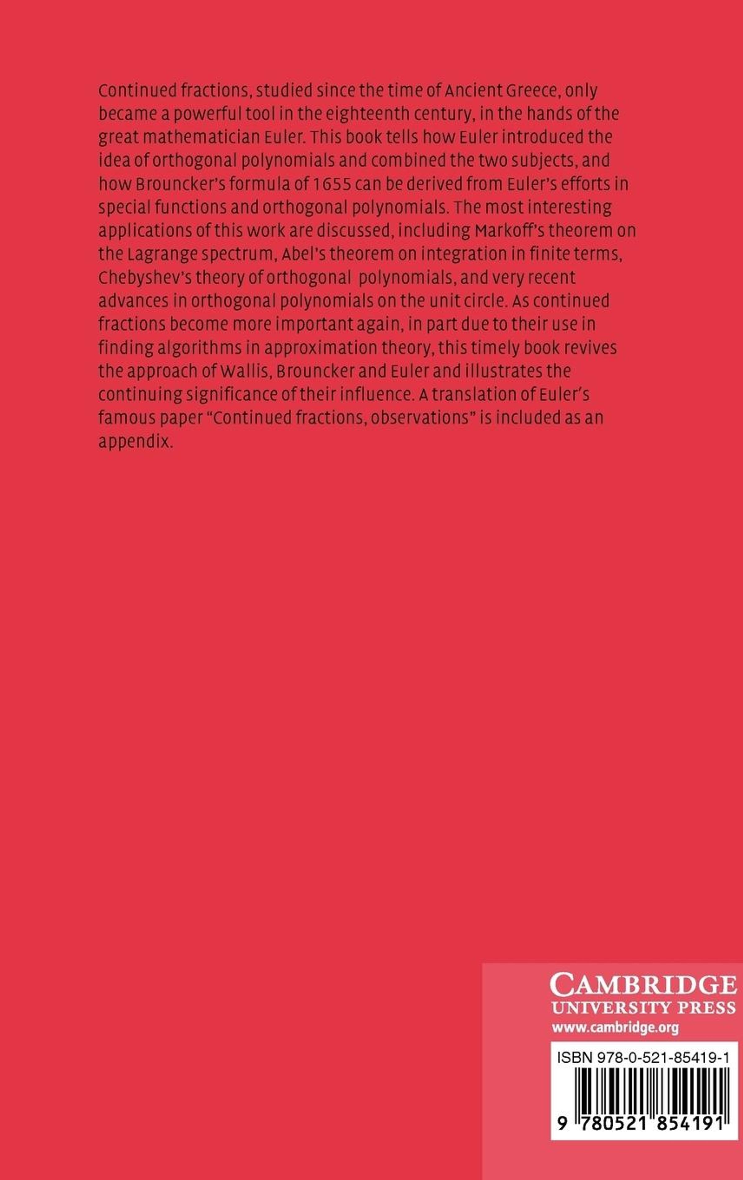 Continued fractions, studied since Ancient Greece, only became a powerful tool in the eighteenth century, in the hands of the great mathematician Euler. This book tells how Euler introduced the idea of orthogonal polynomials and combined the two subjects, and how Brouncker's formula of 1655 can be derived from Euler's efforts in Special Functions and Orthogonal Polynomials. The most interesting applications of this work are discussed, including the great Markoff's Theorem on the Lagrange spectrum, Abel's Theorem on integration in finite terms, Chebyshev's Theory of Orthogonal Polynomials, and very recent advances in Orthogonal Polynomials on the unit circle. As continued fractions become more important again, in part due to their use in finding algorithms in approximation theory, this timely book revives the approach of Wallis, Brouncker and Euler and illustrates the continuing significance of their influence. A translation of Euler's famous paper 'Continued Fractions, Observation' is included as an Addendum.