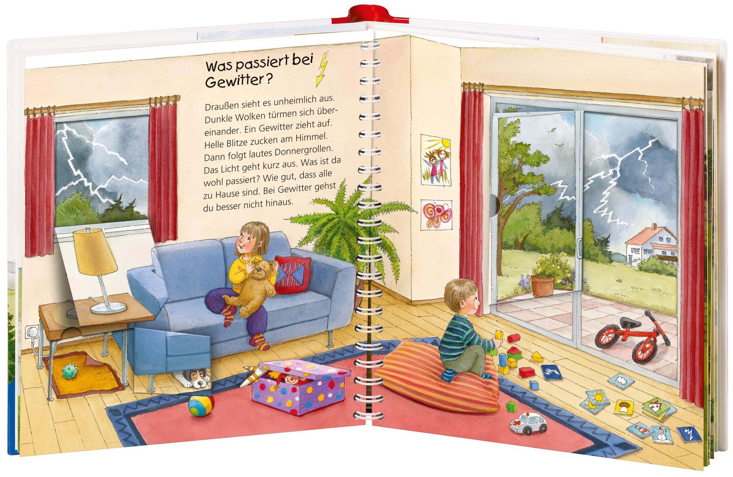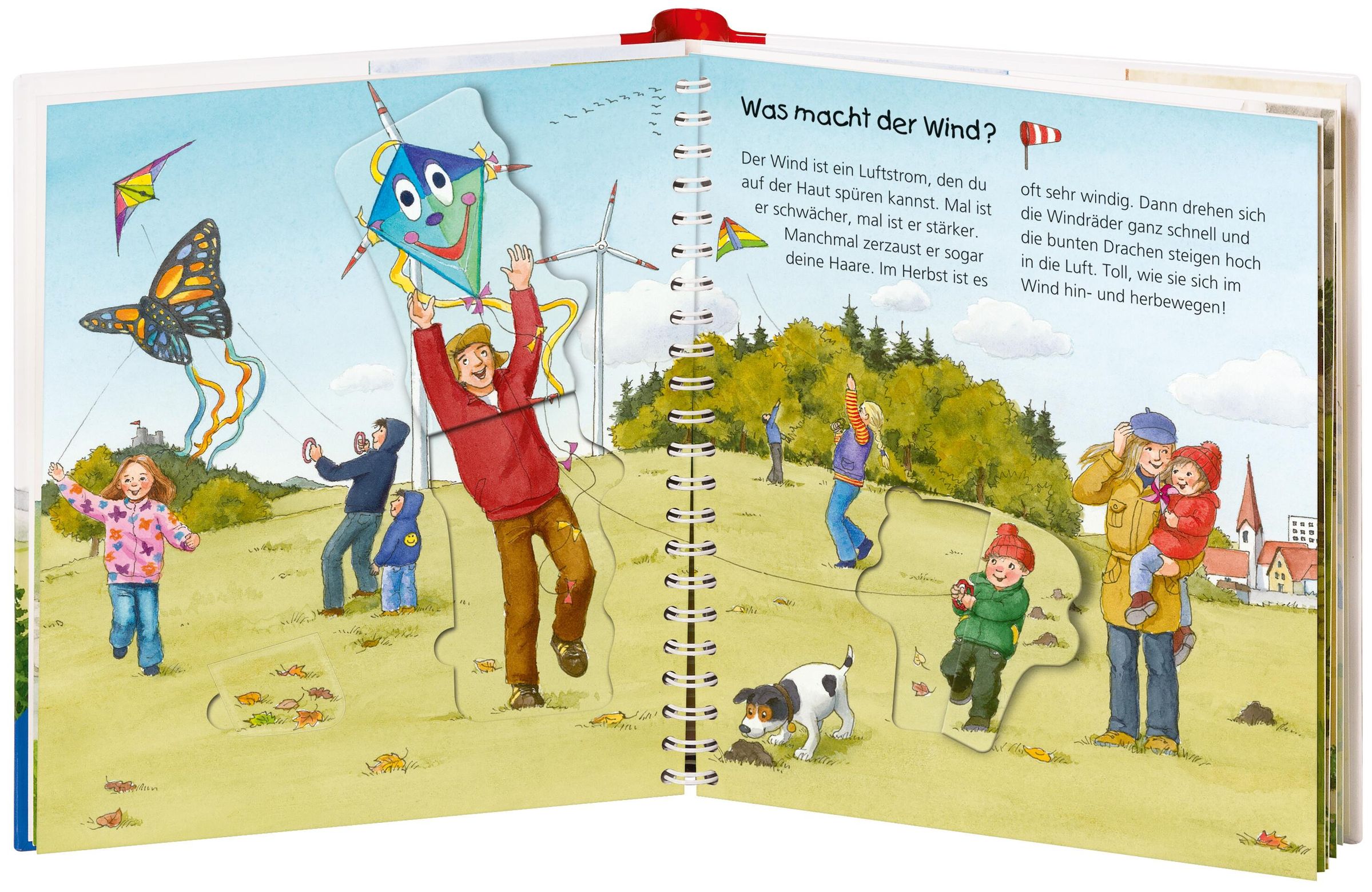 Wieso schneit es im Winter? Was ist Nebel? Wann gibt es einen Regenbogen? Mit diesem Buch lernen Kinder von 2-4 Jahren spielerisch die verschiedenen Wetterphänomene kennen. Anhand großer Bewegungsklappen schauen sie den Wolken beim Vorbeiziehen zu, springen in Pfützen und beobachten, wie ein Gewitter aufzieht. Zugleich finden sich im Buch tolle Ideen für Aktivitäten an Regen-, Wind- und Sonnentagen. Eine Drehscheibenspiel und lustige Wetterreime laden die Kinder zum aktiven Mitmachen ein.