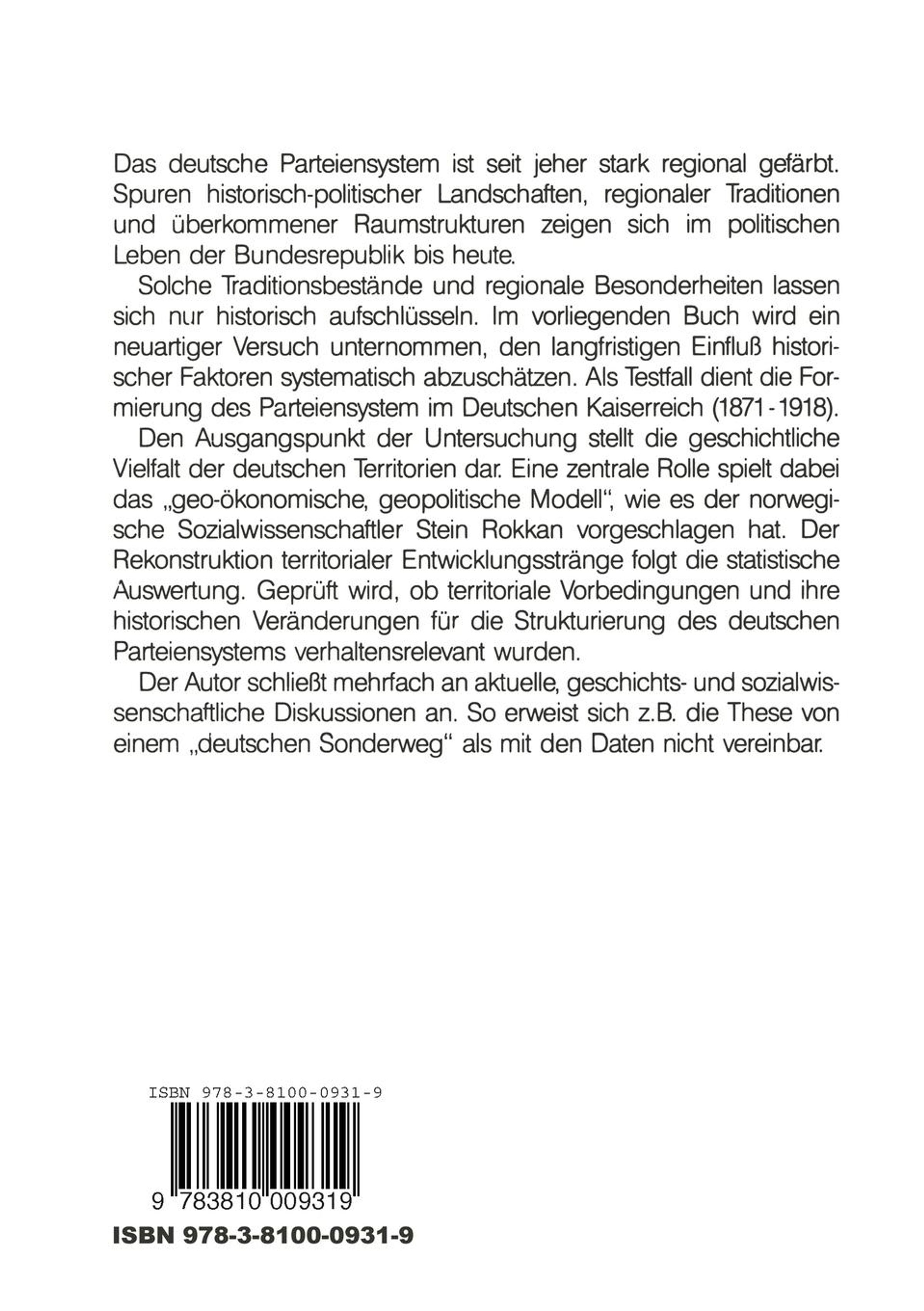 1. Einleitung.- 2. Bereichs- und Entwicklungstheorien: eine integrative Perspektive.- 2.1 Über historische Erklärungen und hierarchische Erklärungsebenen.- 2.2. Zur historischen Unschärfe von Bereichstheorien: das Beispiel der empirischen Wahlforschung.- 2.3 Gibt es brauchbare Entwicklungstheorien?.- 3. Zur Analyse makrohistorischen Wandels: Perspektiven der historisch-vergleichenden Makroforschung.- 3.1 Stein Rokkan: Ein intellektuelles Profil.- 3.2. Das geopolitisch-geoökonomische Modell.- 3.3. Hypothesen und Hypothesentests.- 4. Entwicklungsvariationen im Prozeß der europäischen Nationalstaatsbildung: Elemente einer makrogeschichtlichen Interpretation.- 4.1 Start-Variablen: Ausgangspunkte und Übergänge.- 4.2 Intervenierende Variablen: die europäische Doppelrevolution.- 4.3 Eine Zwischenbilanz.- 5. Zusammenfassung des konzeptuell-theoretischen Teils.- 6. Elemente der Entwicklungskonfiguration Deutschlands.- 6.1 Territorium als raum-zeitlicher Schnittpunkt.- 6.2 Reich und Territorien: der herrschaftsgeschichtliche Strang.- 6.3 Das lange 16.Jahrhundert : der geoökonomische Strang.- 6.4 Urbanisierung, Industrialisierung, Säkularisierung und defensive Modernisierung .- 6.5 Die Geodaten im Überblick.- 7. Geohistorische Entwicklungsmuster und die Strukturierung von Parteialternativen im Deutschen Kaiserreich.- 7.1 Parteien im Kaiserreich.- 7.2 Bivariate Zusammenhänge zwischen den Geo-Variablen.- 7.3 Geostruktur und Parteianwesenheit.- 7.4 Zur Validität makrohistorischer Kontexteffekte.- 8. Geohistorische Kontextbedingungen der Parteienstruktur im Deutschen Kaiserreich.- 8.1 Die Parteien im geohistorischen Raum .- 8.2 Parteienstruktur im Kaiserreich: eine clusteranalytische Perspektive.- 8.3. Regionale und geohistorische Verteilung der Parteienstruktur.- 8.4 Zur Analyse geohistorischer Kausalstrukturen auf der Basis loglineare Modelle.- 8.5 Zur Illustration geohistorischer Entwicklungspfade.- 9. Zusammenfassung des empirisch-analytischen Teils.- 10. Nächste Schritte: Probleme und Perspektiven der vergleichenden Makroforschung.- Landesgeschichtliches Schrifttum.- Tabelle A7.1: Interaktionstherme für Regression auf Parteianwesenheit .- Tabelle A8.1: Cluster-Analyse für Legislaturperiode 13: Auszug.- aus dem Protokoll der Clustervereinigung, Intragruppenvarianz für gewählte Clusterlösung.- Abbildung 8.2: Cluster-Analyse für Legislaturperiode 13: Dendogramm (Auszug).- Tabelle A8.3: Parameter für geohistorisches Pfadmodell.- Datensatz Geodaten .- Kartensatz Territorialverteilung .- IW Städtestruktur.- IT Geopolitik.- IK Ethnostruktur.- IIW Geoökonomie.- IIT Territorialkontrolle.- IIK Reformation.- IIIT Landstände.- IVW Ressourcenkombination.- VW Industrialisierung.- VK Kirche-Staat-Konflikt.- Parteienstruktur im Deutschen Kaiserreich.- Parteienstruktur im Deutschen Kaiserreich (vereinfacht).- Tabelle 6.1: Frühneuzeitliche Städtedaten für das Deutsche Reich.- Tabelle 6.2: Häufigkeitsverteilung der Geodaten.- Tabelle 6.3: Region als Verteilung der Geodaten.- Tabelle 7.1: Parteianwesenheit im Deutschen Kaiserreich.- Tabelle 7.2: Geostrukturelle Korrelationen.- Tabelle 7.3: Korrelation: Geodaten und Parteianwesenheit.- Tabelle 7.4: Regressionsmodell für Parteianwesenheit: Zentrum.- Tabelle 7.5: Verschiedene Interaktionsterme für die Variable IIK.- Tabelle 7.6: Regressionsmodell für Parteianwesenheit: Agrariergruppen.- Tabelle 7.7: Regressionsmodell für Parteianwesenheit: Konservative.- Tabelle 7.8: Regressionsmodell für Parteianwesenheit: Reichskonservative.- Tabelle 7.9: Regressionsmodell für Parteianwesenheit: Nationalliberale.- Tabelle 7.10: Regressionsmodell für Parteianwesenheit: Linksliberale.- Tabelle 7.11: Regressionsmodell für Parteianwesenheit: Sozialdemokraten.- Tabelle 7.12: Regressionsmodell für Parteianwesenheit: Protestgruppen.- Tabelle 7.13: Multiple Klassifikationsanalyse für Parteienstruktur und Parteianwesenheit mit Wirtschaftsstruktur und Konfessionsverteilung als Kovariaten.- Tabel