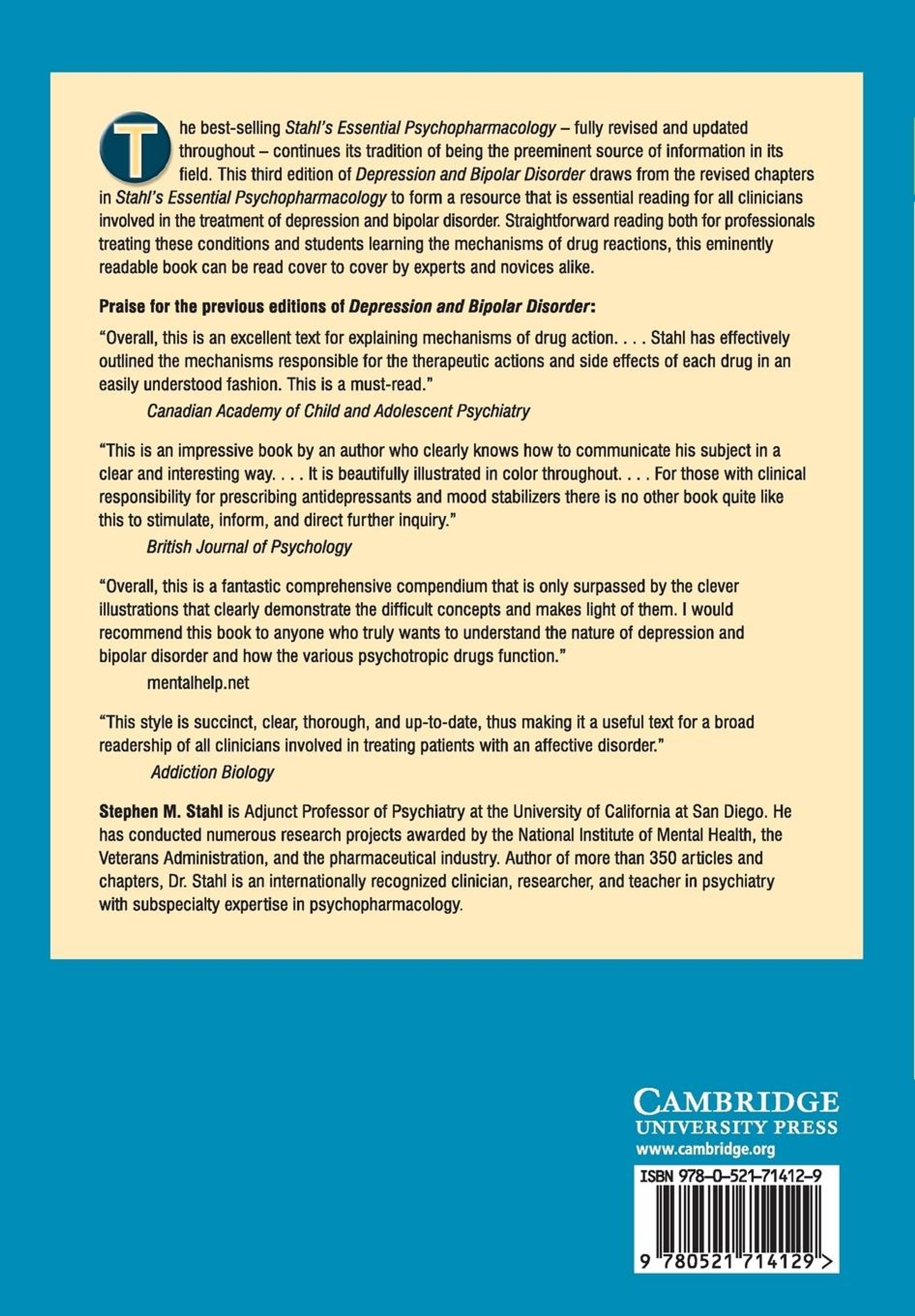 Stephen M. Stahl is Adjunct Professor of Psychiatry at the University of California, San Diego. He has conducted numerous research projects awarded by the National Institute of Mental Health, the Veterans Administration, and the pharmaceutical industry. Author of more than 300 articles and chapters, Dr Stahl is an internationally recognized clinician, researcher, and teacher in psychiatry with subspecialty expertise in psychopharmacology.
