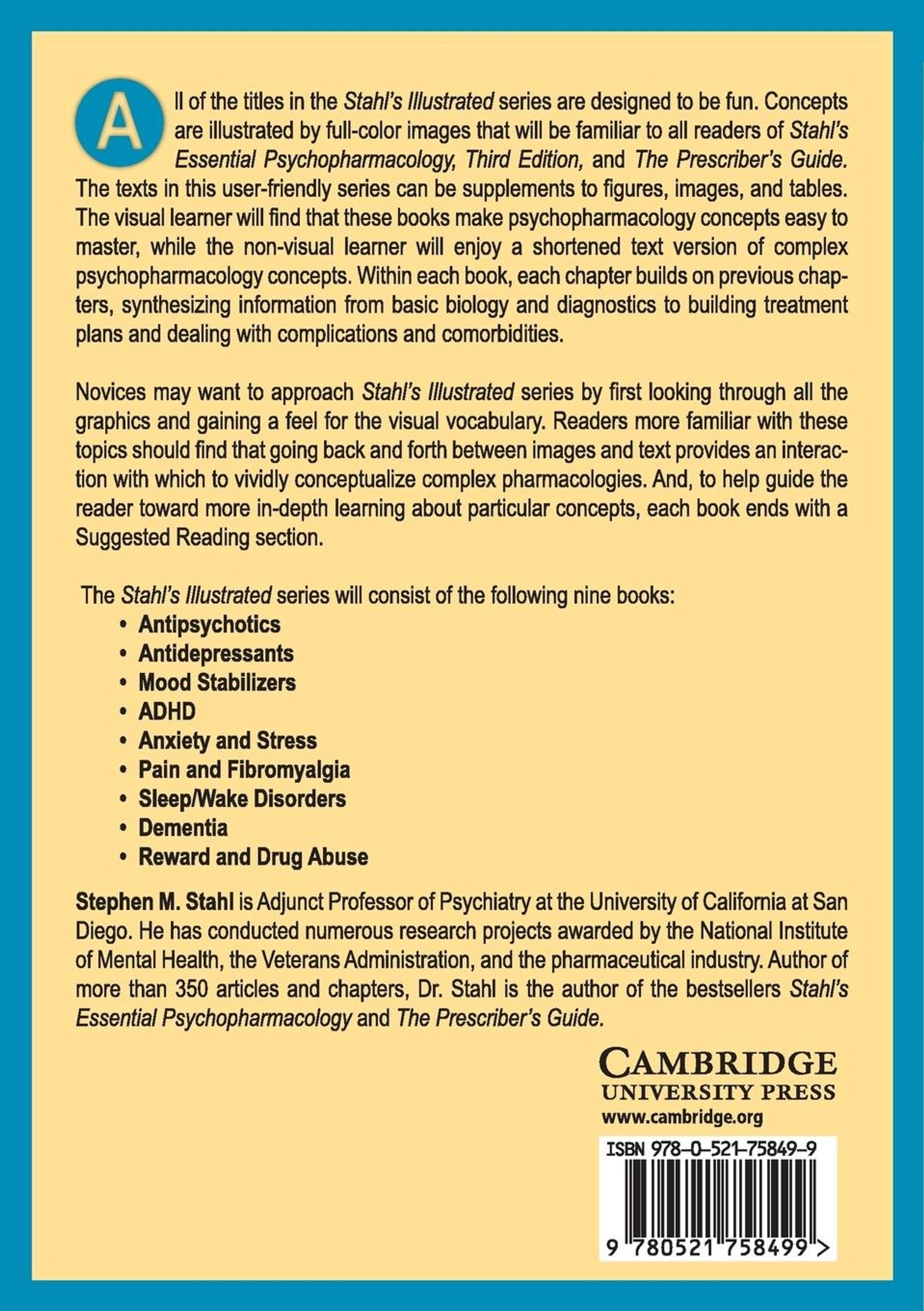 Stephen M. Stahl is Adjunct Professor of Psychiatry at the University of California, San Diego. He has conducted numerous research projects awarded by the National Institute of Mental Health, the Veterans Administration, and the pharmaceutical industry. Author of more than 300 articles and chapters, Dr Stahl is an internationally recognized clinician, researcher, and teacher in psychiatry with subspecialty expertise in psychopharmacology.