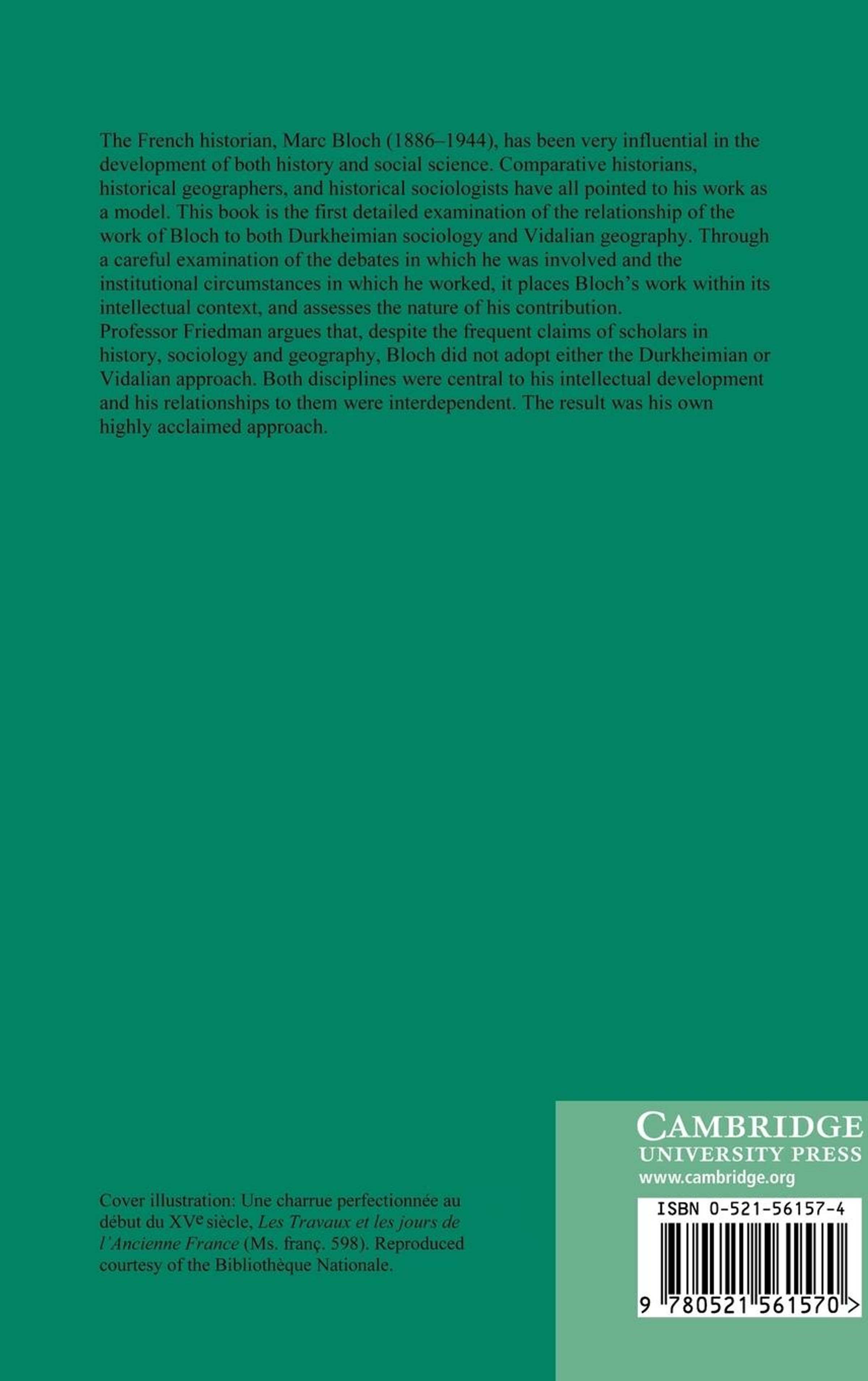 The French historian Marc Bloch has often been praised for his interdisciplinary approach. This book demonstrates the importance of both Vidalian geography and Durkheimian sociology for Bloch and the significant, but often overlooked, differences between his approach and theirs. In contrast to much other work on Bloch, Professor Friedman highlights the intellectual and institutional contexts of Bloch's works, arguing that only by a careful examination of the debates in which he was involved can one begin to come to terms with the nature of his contribution.