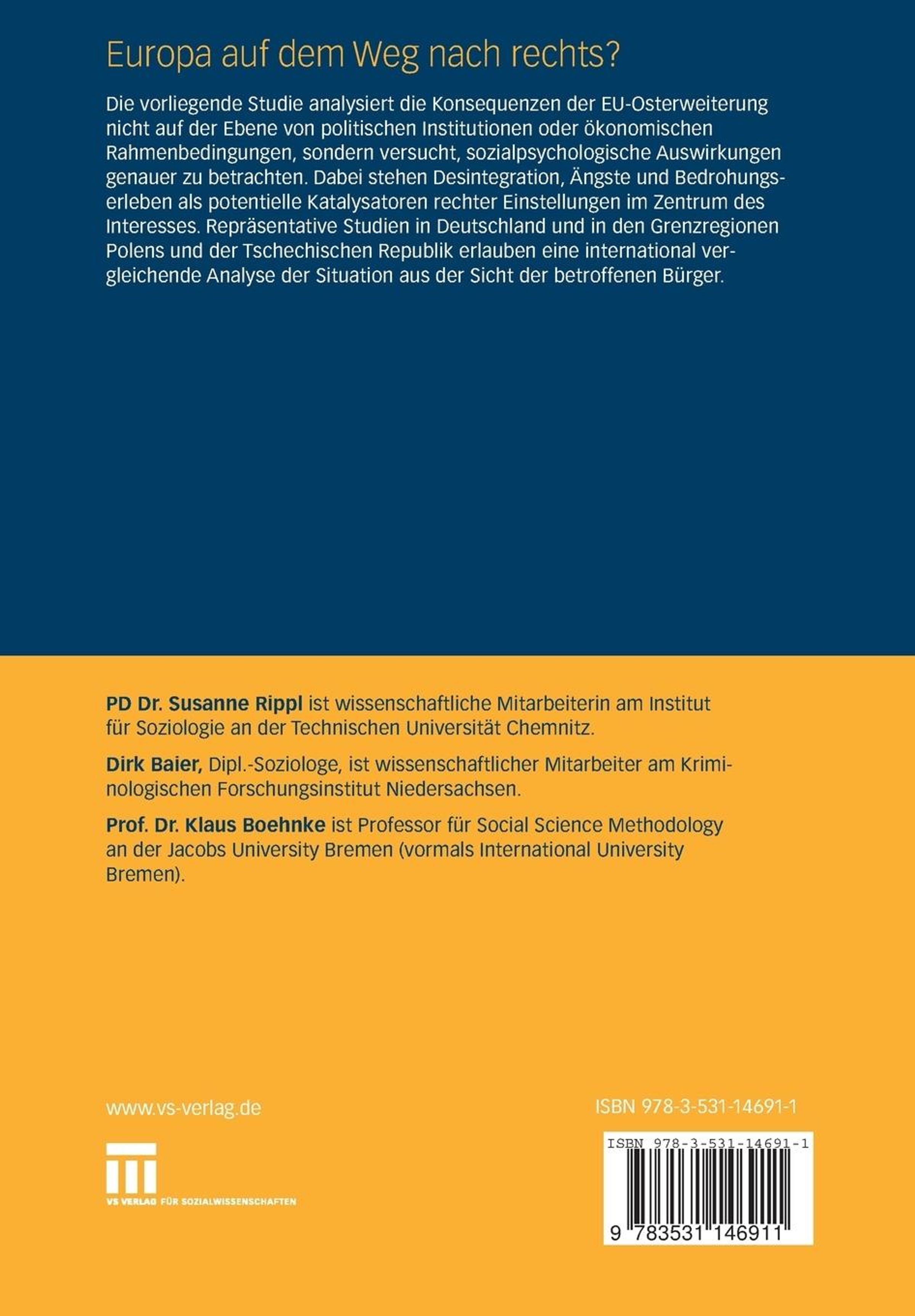 Die EU-Osterweiterung im Kontext der Rechtsextremismusforschung - Ängste und Bedrohungsgefühle als Reaktion auf die Osterweiterung - Ängste und Bedrohungsgefühle - Deutschland, Polen und Tschechien im Vergleich - Bedrohungsgefühle als Reaktion auf politischen Wandel - Bedrohungsgefühle, Desintegration und rechte Orientierungen - Ellenbogenmentalität als Motor für Fremdenfeindlichkeit? - EU-Osterweiterung als Kontext autoritärer Reaktionen?
