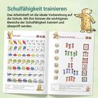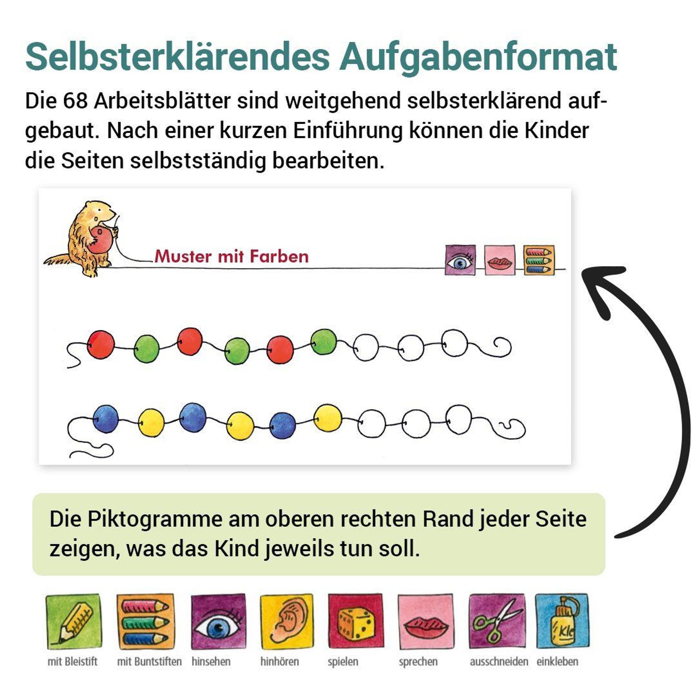 Die 68 Arbeitsblätter sind weitgehend selbsterklärend aufgebaut. Nach einer kurzen Einführung können die Kinder die Seiten selbstständig bearbeiten. Piktogramme am oberen rechten Rand zeigen, welche Tätigkeiten jeweils durchzuführen sind.