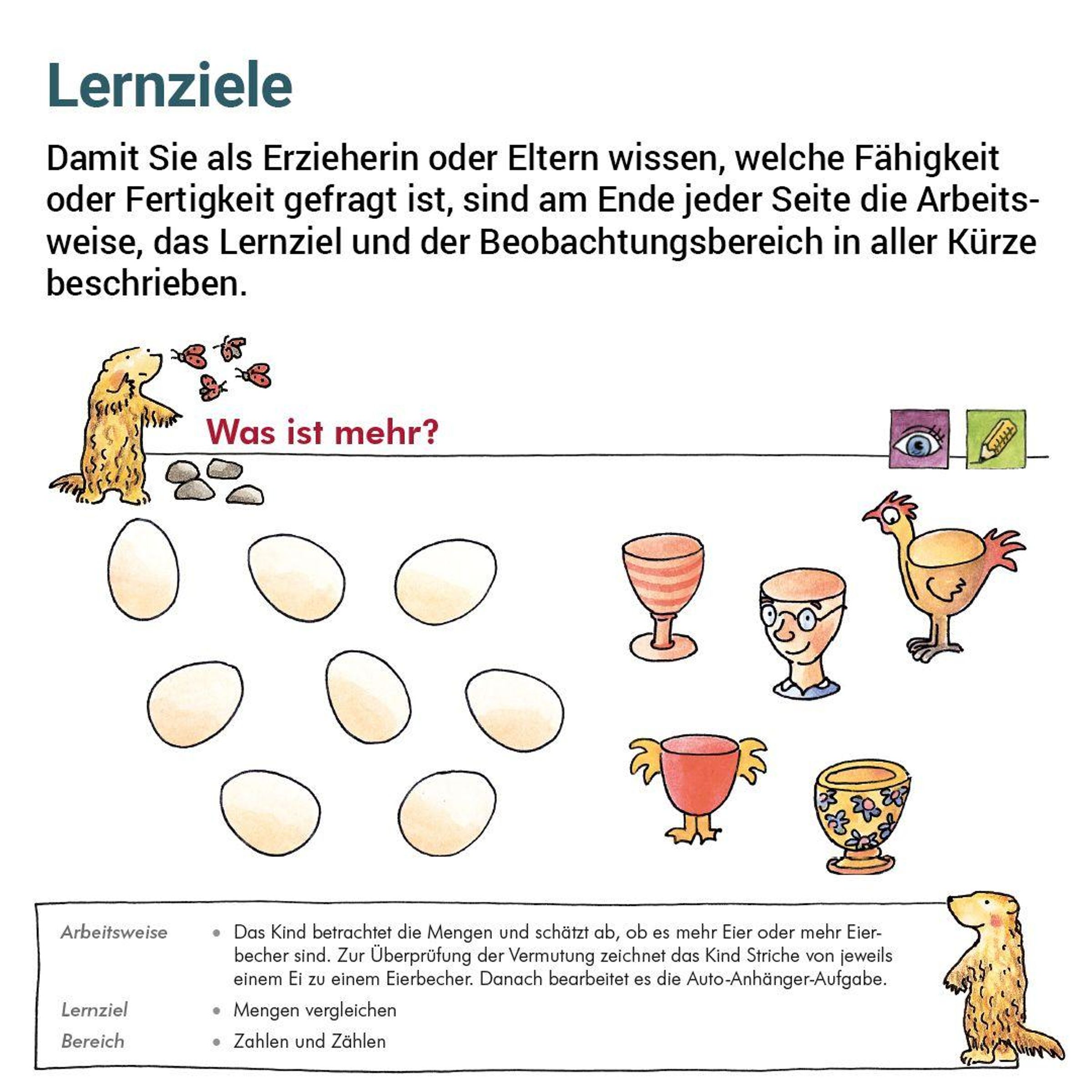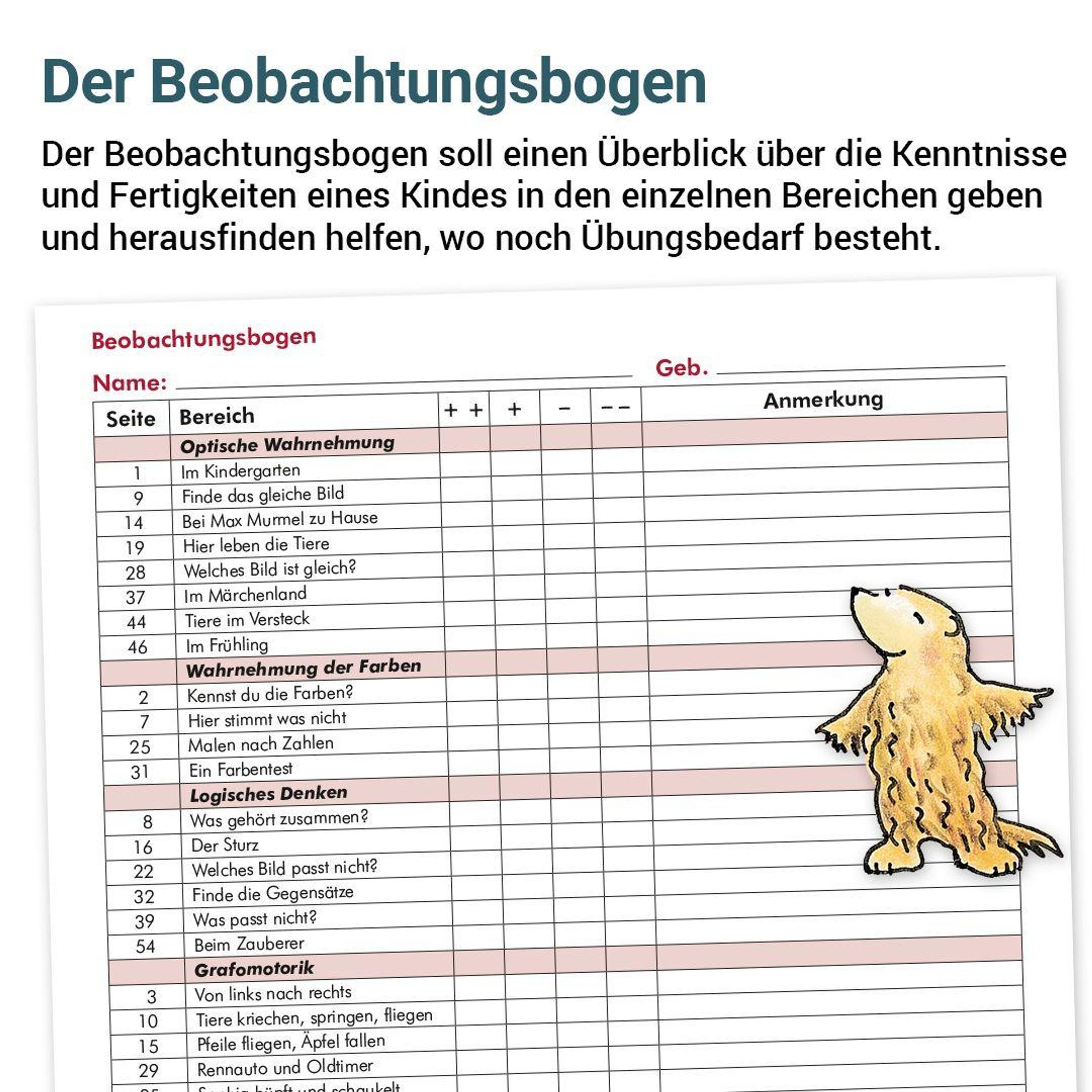 Das Lernziel sowie die jeweilige Arbeitsweise sind am Ende jeder Seite zur schnellen Information kurz und prägnant beschrieben. Jedem Heft ist ein Beobachtungsbogen beigefügt. Dieser gibt der Erzieherin / dem Erzieher, den Eltern oder den Kooperationslehrkräften präzise Rückmeldung über den Leistungsstand des Kindes. Diese Dokumentation bietet eine fundierte Grundlage für Beratungsgespräche.