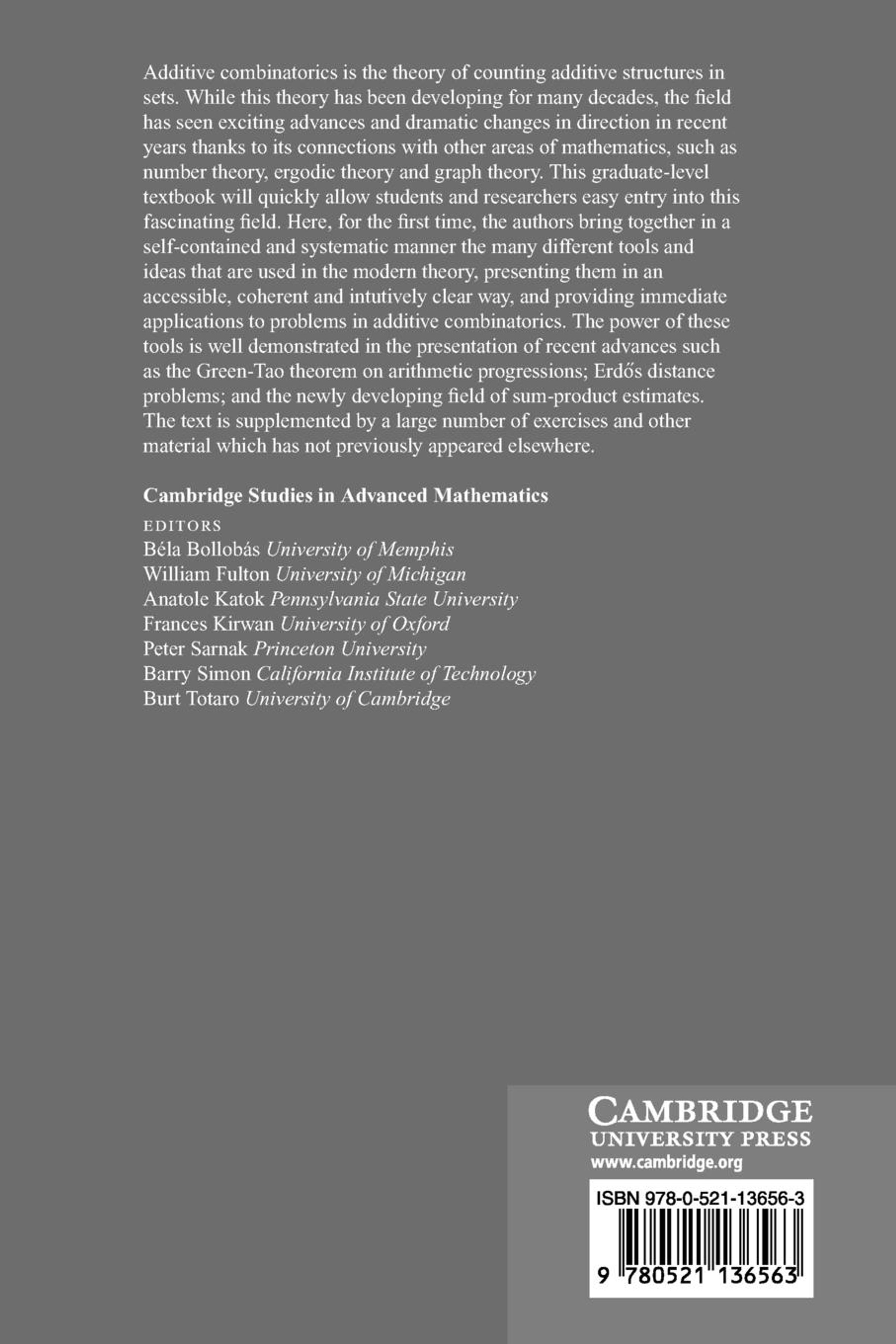 Additive combinatorics is the theory of counting additive structures in sets. This theory has seen exciting developments and dramatic changes in direction in recent years thanks to its connections with areas such as number theory, ergodic theory and graph theory. This graduate-level 2006 text will allow students and researchers easy entry into this fascinating field. Here, the authors bring together in a self-contained and systematic manner the many different tools and ideas that are used in the modern theory, presenting them in an accessible, coherent, and intuitively clear manner, and providing immediate applications to problems in additive combinatorics. The power of these tools is well demonstrated in the presentation of recent advances such as Szemerédi's theorem on arithmetic progressions, the Kakeya conjecture and Erdos distance problems, and the developing field of sum-product estimates. The text is supplemented by a large number of exercises and new results.