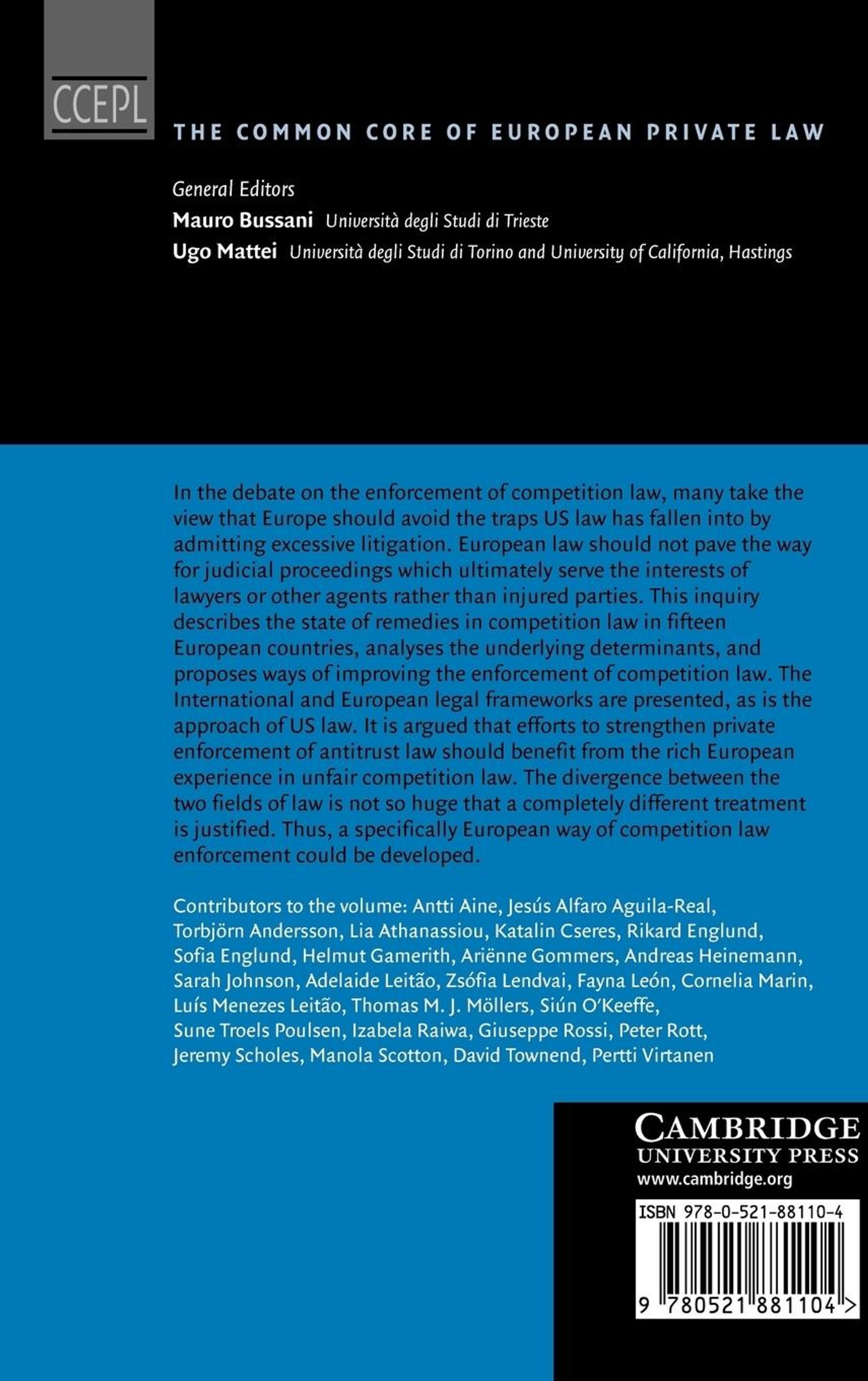 In the debate on the enforcement of competition law, many take the view that Europe should avoid the traps US law has fallen into by admitting excessive litigation. European law should not pave the way for judicial proceedings which ultimately serve the interests of lawyers or other agents rather than injured parties. This inquiry describes the state of remedies in competition law in fifteen European countries, analyses the underlying determinants, and proposes ways of improving the enforcement of competition law. The International and European legal frameworks are presented, as is the approach of US-American law. It is argued that efforts to strengthen private enforcement of antitrust law should benefit from the rich European experience in unfair competition law. The divergence between the two fields of law is not so huge that a completely different treatment is justified. Thus, a specifically European way of competition law enforcement could be developed.