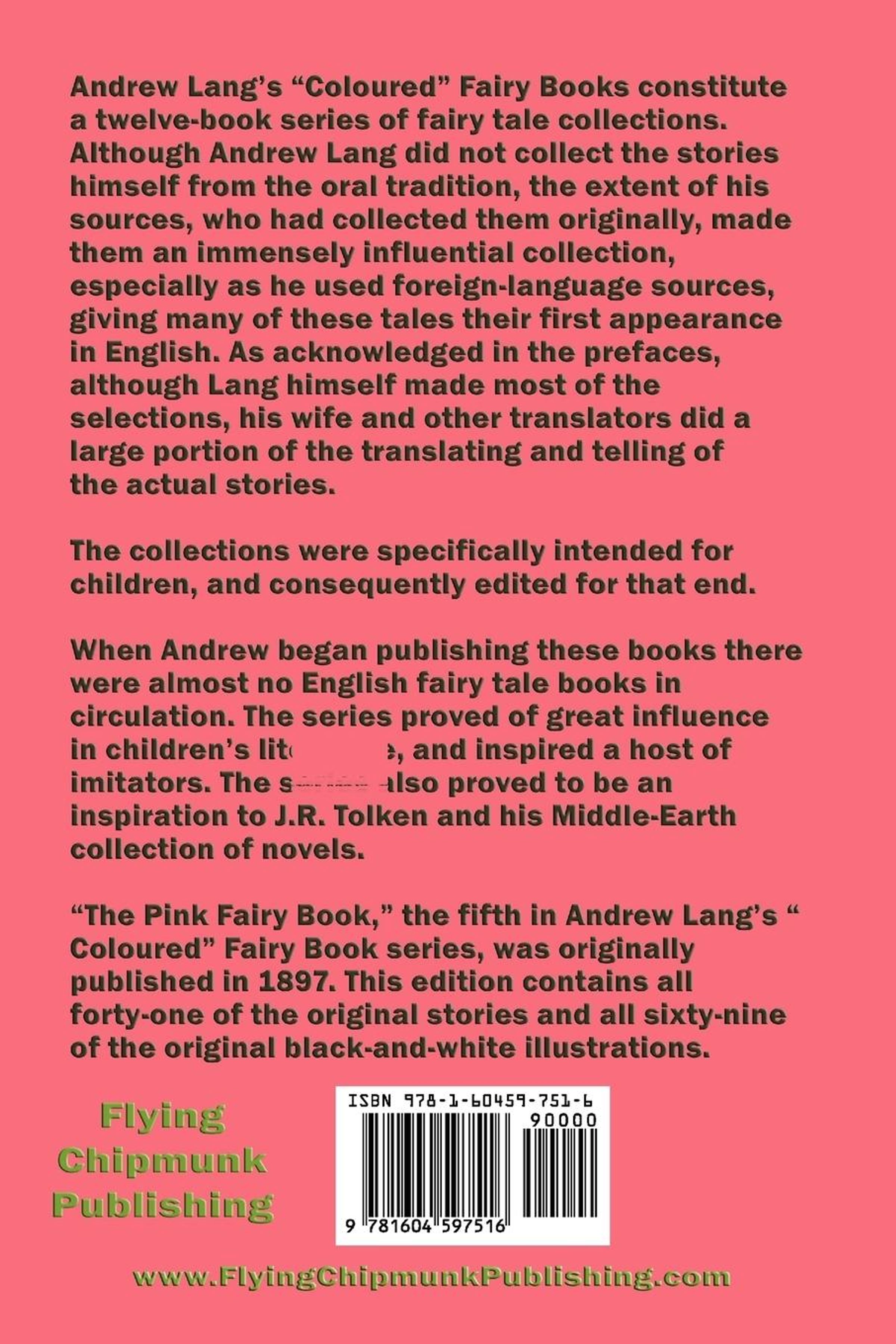 ¿The Pink Fairy Book¿, the fifth in Andrew Lang¿s ¿Coloured¿ Fairy Book series, was originally published in 1897. This edition contains all 41 of the original stories and all 69 of the original black-and-white illustrations. *** The collections were specifically intended for children, and consequently edited for that end. *** When Andrew began publishing these books there were almost no English fairy tale books in circulation. The series proved of great influence in children¿s literature, and inspired a host of imitators. The series also proved to be an inspiration to J. R. Tolken and his Middle-Earth collection of novels. *** This book contains these stories: The Cat¿s Elopement; How the Dragon Was Tricked; The Goblin and the Grocer; The House in the Wood; Uraschimataro and the Turtle; The Slaying of the Tanuki; The Flying Trunk; The Snow-man; The Shirt-collar; The Princess in the Chest; The Three Brothers; The Snow-queen; The Fir-tree; Hans, the Mermaid¿s Son; Peter Bull; The Bird ¿Grip¿; Snowflake; I Know What I Have Learned; The Cunning Shoemaker; The King Who Would Have a Beautiful Wife; Catherine and Her Destiny; How the Hermit Helped to Win the King¿s Daughter; The Water of Life; The Wounded Lion; The Man Without a Heart; The Two Brothers; Master and Pupil; The Golden Lion; The Sprig of Rosemary; The White Dove; The Troll¿s Daughter; Esben and the Witch; Princess Minon-minette; Maiden Bright-eye; The Merry Wives; King Lindorm; The Jackal; the Dove; and the Panther; The Little Hare; The Sparrow with the Slit Tongue; The Story of Ciccu; and Don Giovanni De La Fortuna. * * * * Check out the other Andrew Lang books published by Flying Chipmunk Publishing at www. FlyingChipmunkPublishing. com, or Friend us on Facebook for our latest releases.