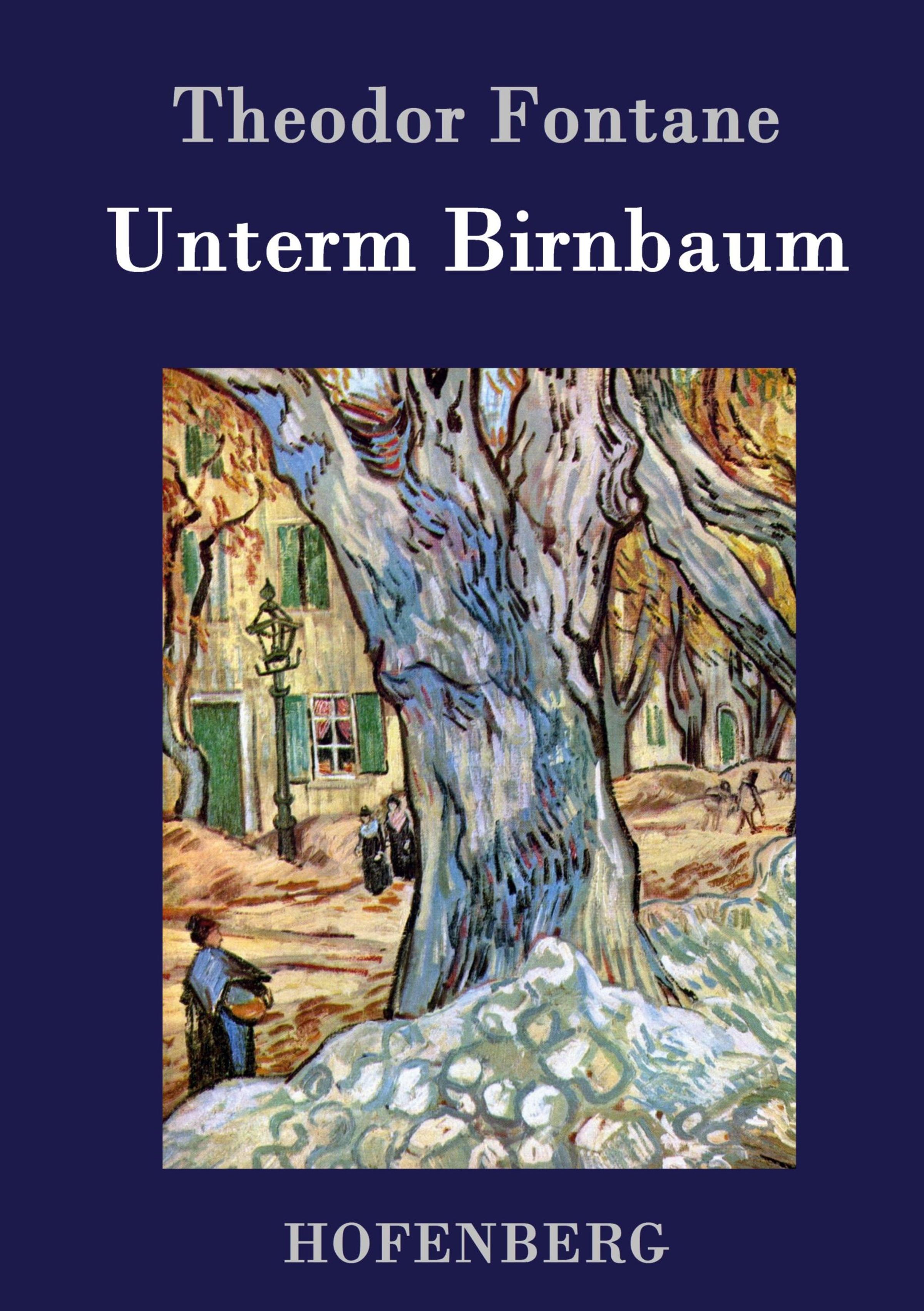„Theodor Fontane, Unterm Birnbaum“. Unten „HOFENBERG“. Kunstwerk mit Baum und Personen im Hintergrund., Buch