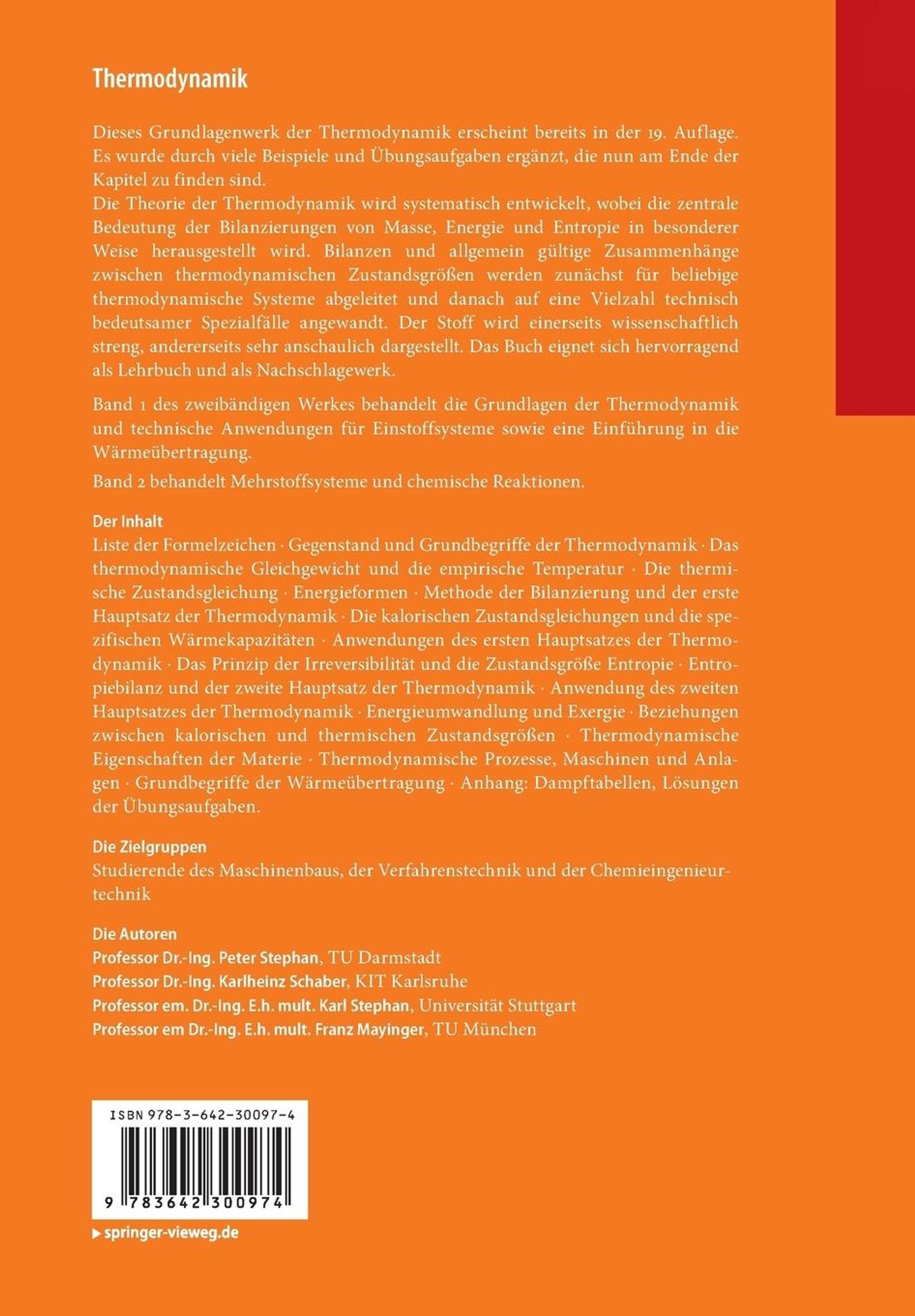 Band 1 des zweibändigen Werkes enthält u. a. eine Einführung in die Wärmeübertragung, ein Kapitel über Stoffeigenschaften, ein Kapitel über die wichtigsten thermodynamischen Prozesse, Berechnungsbeispiele mit ausführlichen Lösungen sowie Übungsaufgaben. Das Buch eignet sich hervorragend als Lehrbuch und als Nachschlagewerk. Band 2 behandelt Mehrstoffsysteme und chemische Reaktionen.