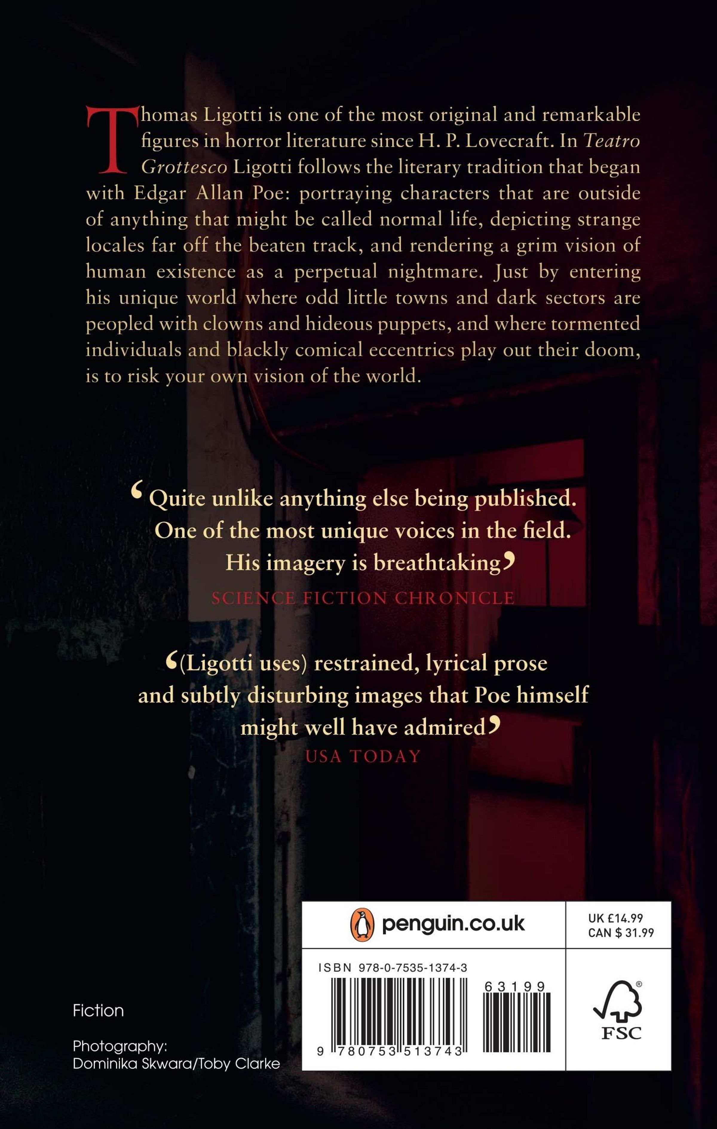 Thomas Ligotti is often cited as the most curious and remarkable figure in horror literature since H. P. Lovecraft. His work is noted by critics for its display of an exceptionally grotesque imagination and accomplished prose style. In his stories, Ligotti has followed a literary tradition that began with Edgar Allan Poe, portraying characters that are outside of anything that might be called normal life, depicting strange locales far off the beaten track, and rendering a grim vision of human existence as a perpetual nightmare. The horror stories collected in Teatro Grottesco feature tormented individuals who play out their doom in various odd little towns, as well as in dark sectors frequented by sinister and often blackly comical eccentrics. The cycle of narratives introduce readers to a freakish community of artists who encounter demonic perils that ultimately engulf their lives.