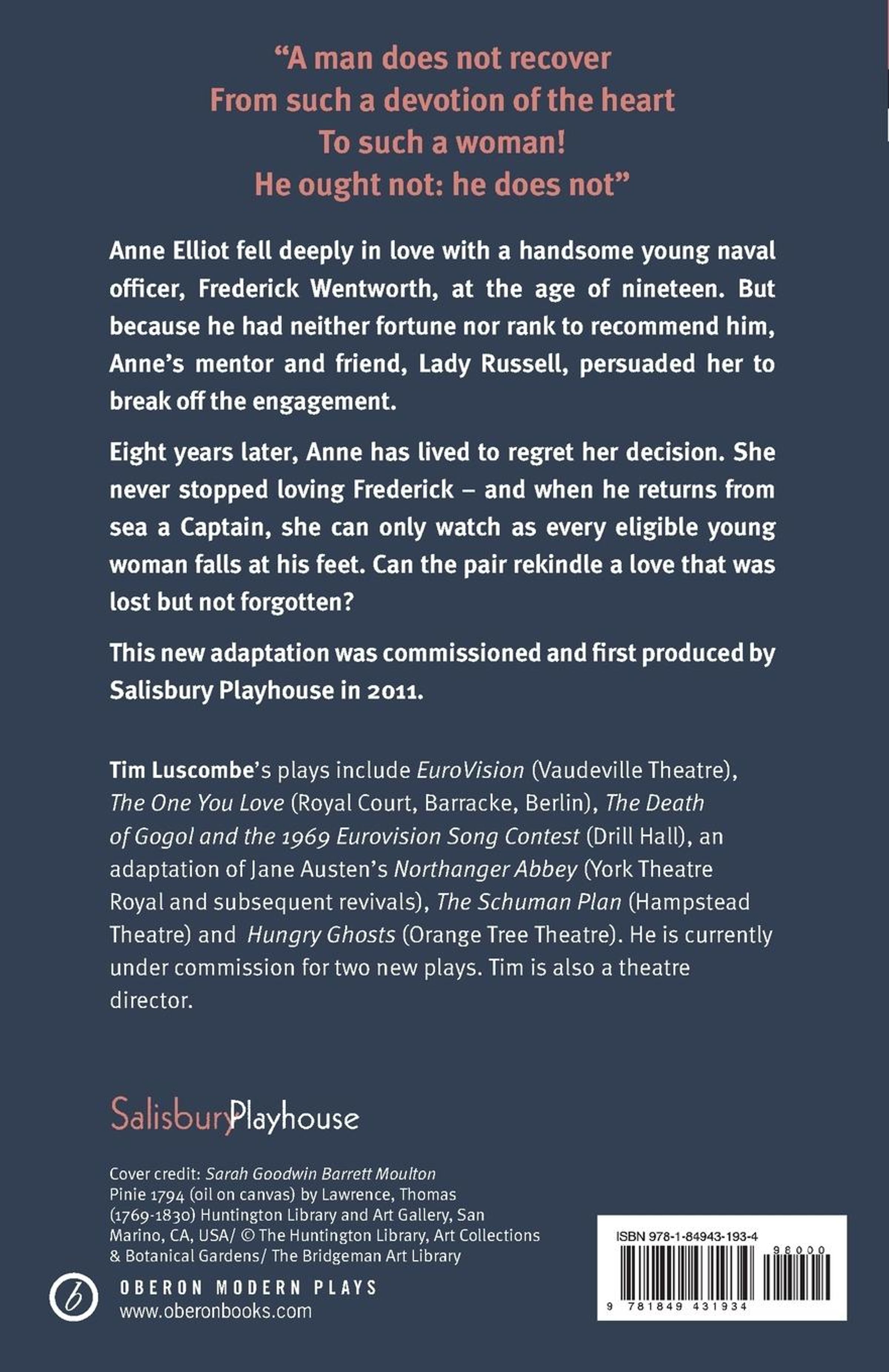 Anne Elliot fell deeply in love with a handsome young naval officer, Frederick Wentworth, at the age of nineteen. But because he had neither fortune nor rank to recommend him, Anne's mentor and friend, Lady Russell, persuaded her to break off the engagement. Eight years later, Anne has lived to regret her decision. She never stopped loving Frederick - and when he returns from sea a Captain, she can only watch as every eligible young woman falls at his feet. Can the pair rekindle a love that was lost but not forgotten? This new adaptation was commissioned and first produced by Salisbury Playhouse in 2011.