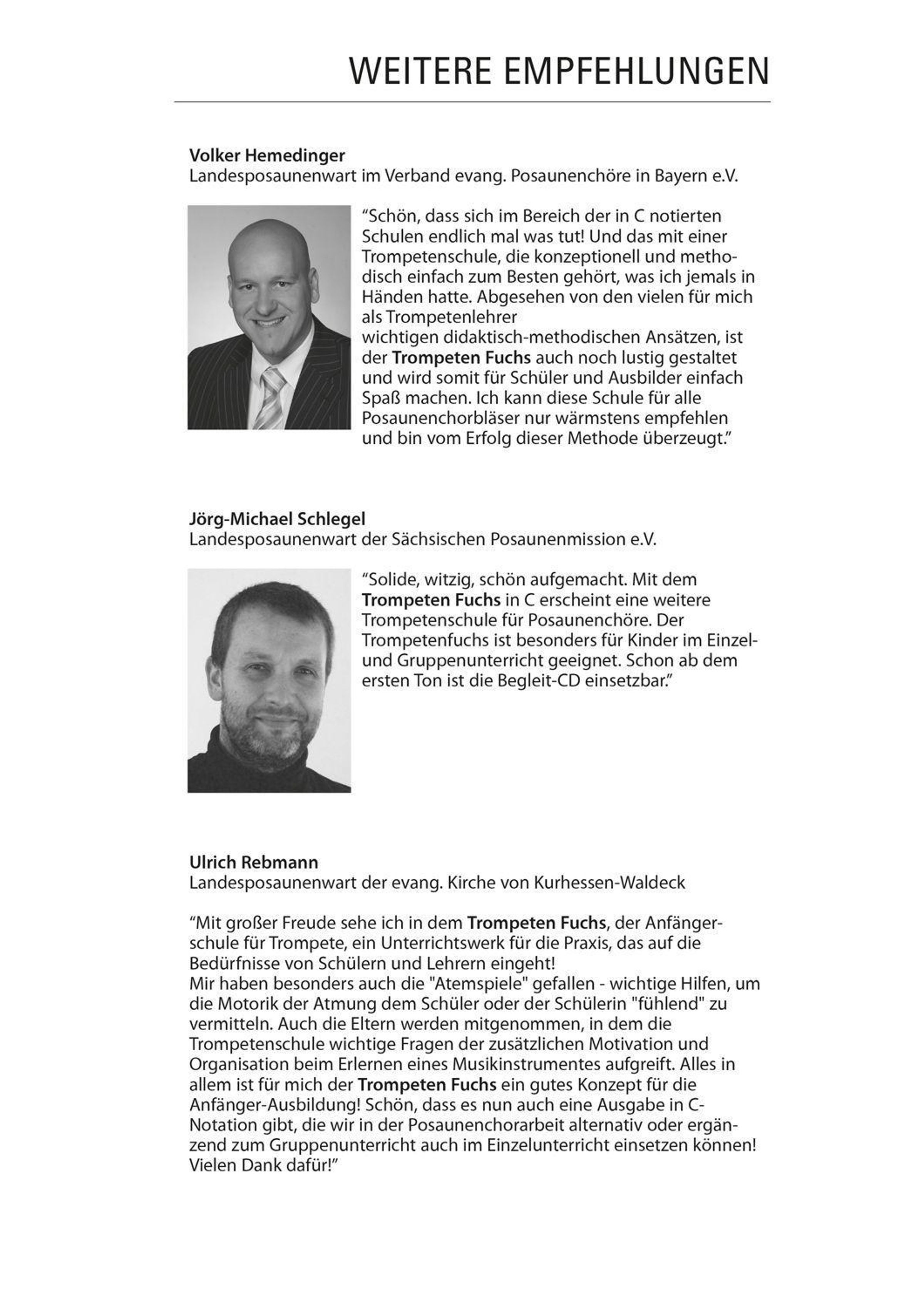 Internationale Spitzenlehrer wie Reinhold Friedrich und Bo Nielsson empfehlen diese Schule. Warum? Weil das Konzept des Trompeten Fuchs wirklich funktioniert. Unzählige tolle Solostücke und Duette, musikalisch wertvolle Etüden, technische-, flexibilitäts- und ansatzaufbauende Übungen sowie ein lyrisch-sanglicher Zugang zur "Kunst des Trompetenspiels" tragen mit dazu bei, dass die Schüler nicht nur gut spielen, sondern auch gut klingen.