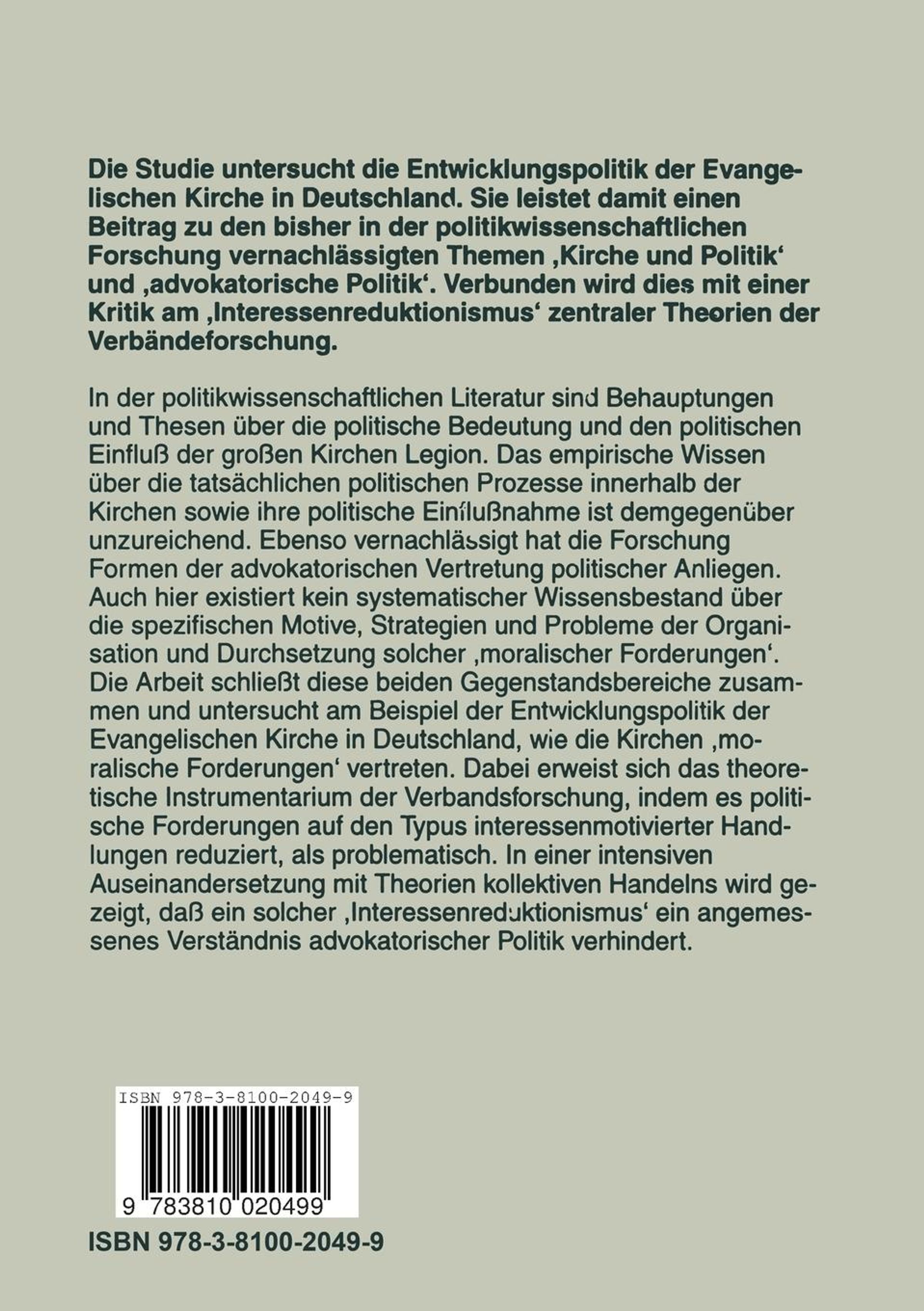 1. Moralische Forderungen und Interessen eine theoretische und analytische Bestimmung ihres Verhältnisses.- 2. Strategien der Organisation moralischer Forderungen in politischen Gesellschaften: eine exemplarische Auseinandersetzung mit dem sozialwissenschaftlichen Interessenreduktionismus.- 3. Die Gelegenheitsstrukturen protestantischer Entwicklungspolitik.- 4. Entstehung, Etablierung und Entwicklung des kirchlichen Entwicklungsdienstes: Geschichte und Vorgeschichte des protestantischen Internationalismus.- 5. Strategien der Durchsetzung protestantischer entwicklungspolitischer Forderungen.- 6. Strategien der Legitimation protestantischer entwicklungspolitischer Forderungen.- 7. Strategien und Probleme advokatorischer Politik am Beispiel der Entwicklungspolitik der Evangelischen Kirche in Deutschland: Resümee und Ausblick.