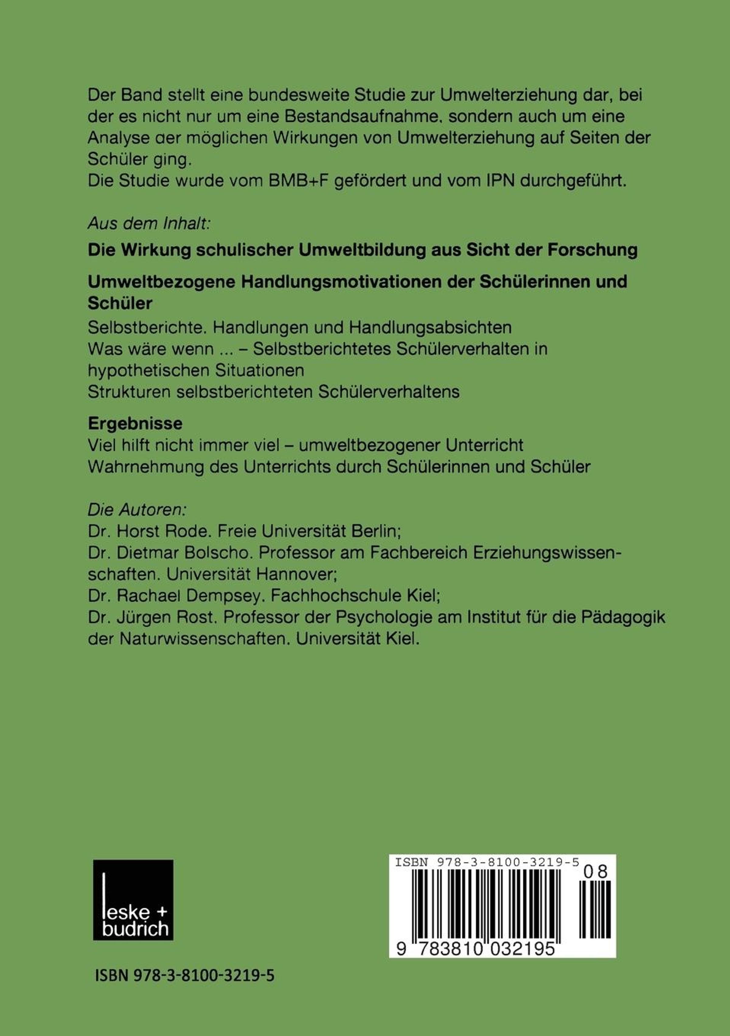 Der Band stellt eine bundesweite Studie zur Umwelterziehung dar, bei der es nicht nur um eine Bestandsaufnahe, sondern auch um eine Analyse der möglichen Wirkungen von Umwelterziehung auf Seiten der Schüler gibt.