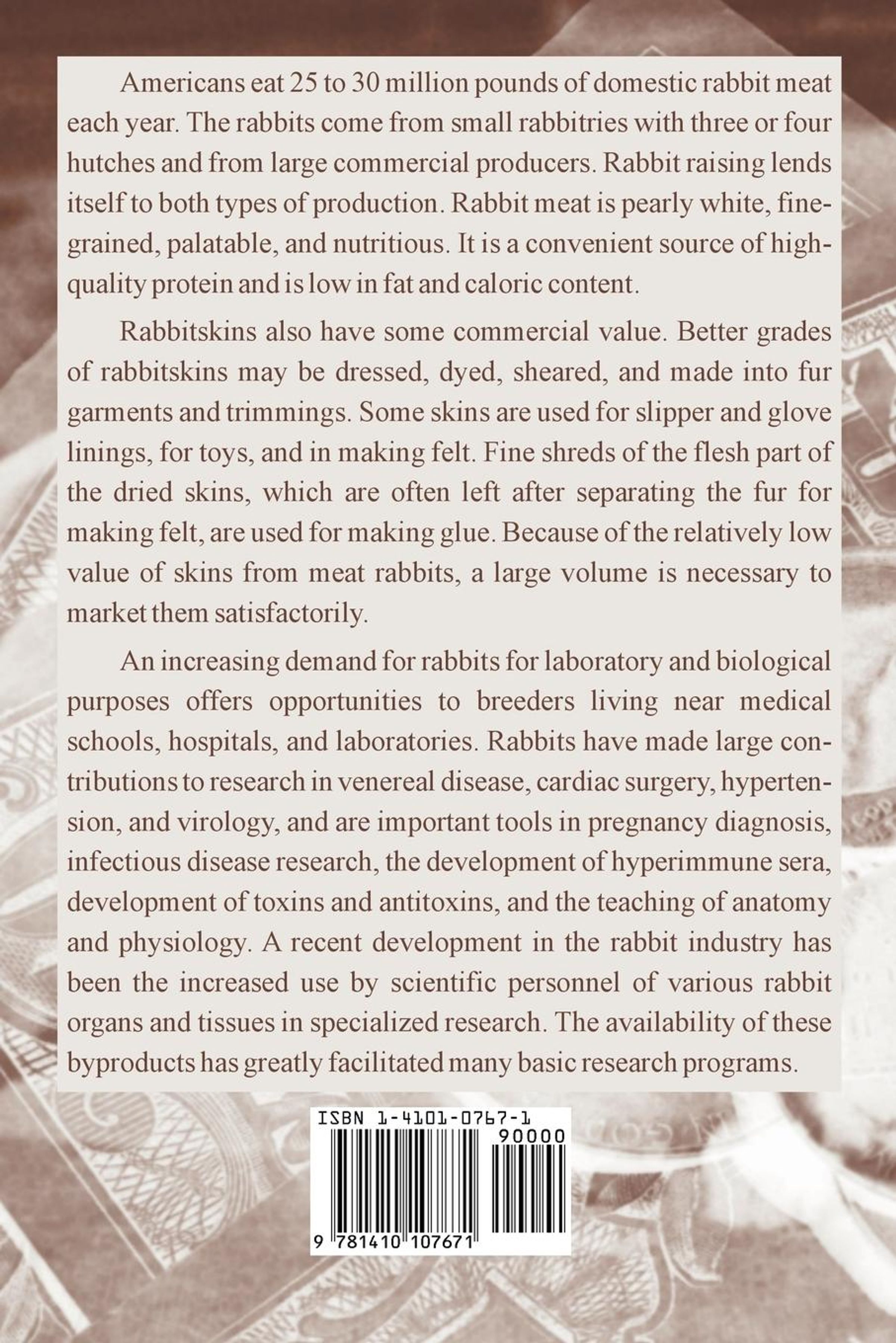 Americans eat 25 to 30 million pounds of domestic rabbit meat each year. The rabbits come from small rabbitries with three or four hutches and from large commercial producers. Rabbit raising lends itself to both types of production. Rabbit meat is pearly white, fine-grained, palatable, and nutritious. It is a convenient source of high-quality protein and is low in fat and caloric content. Rabbitskins also have some commercial value. Better grades of rabbitskins may be dressed, dyed, sheared, and made into fur garments and trimmings. Some skins are used for slipper and glove linings, for toys, and in making felt. Fine shreds of the flesh part of the dried skins, which are often left after separating the fur for making felt, are used for making glue. Because of the relatively low value of skins from meat rabbits, a large volume is necessary to market them satisfactorily. An increasing demand for rabbits for laboratory and biological purposes offers opportunities to breeders living near medical schools, hospitals, and laboratories. Rabbits have made large contributions to research in venereal disease, cardiac surgery, hypertension, and virology, and are important tools in pregnancy diagnosis, infectious disease research, the development of hyperimmune sera, development of toxins and antitoxins, and the teaching of anatomy and physiology. A recent development in the rabbit industry has been the increased use by scientific personnel of various rabbit organs and tissues in specialized research. The availability of these byproducts has greatly facilitated many basic research programs.