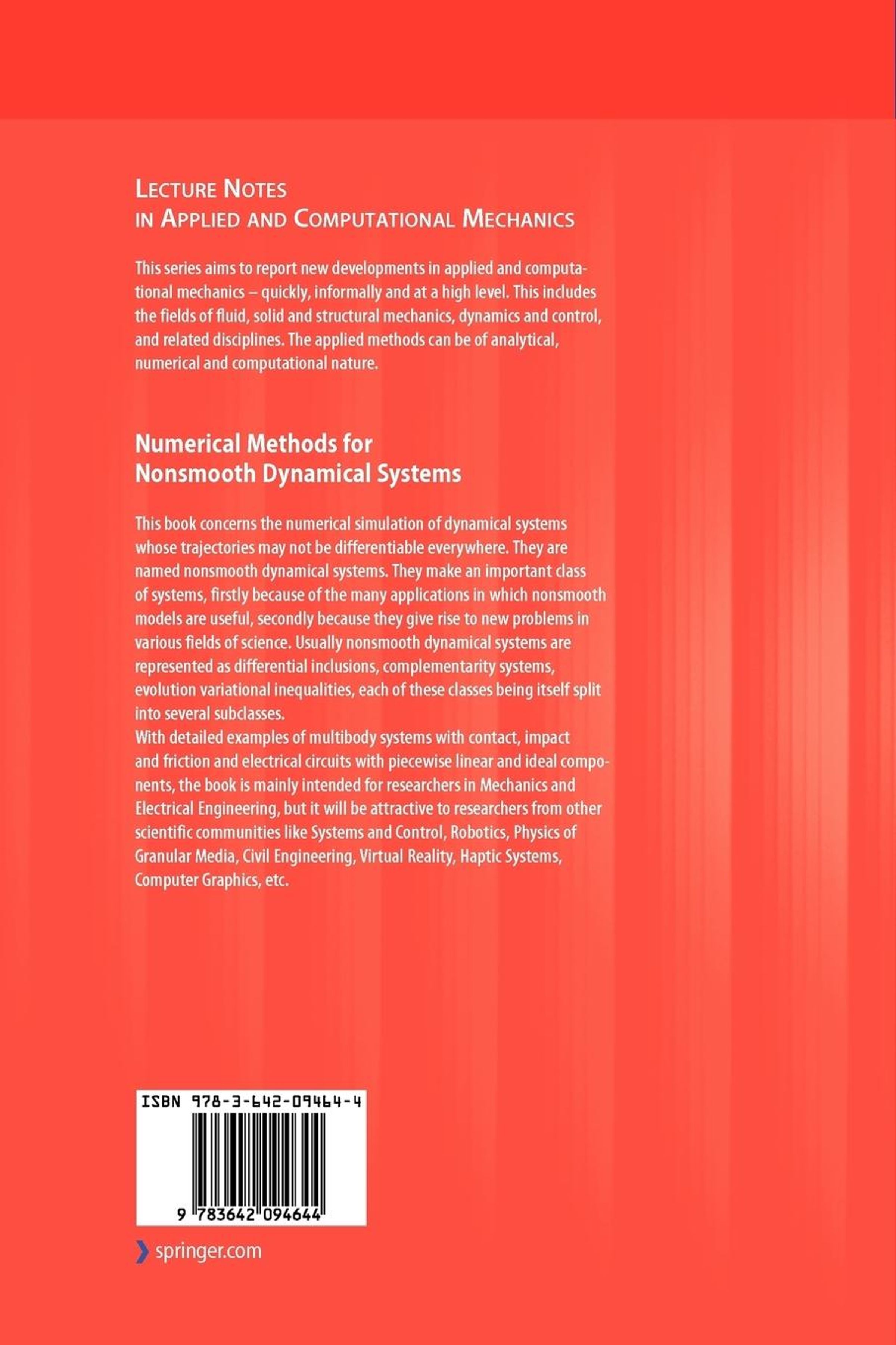 This book concerns the numerical simulation of dynamical systems whose trajec- ries may not be differentiable everywhere. They are named nonsmooth dynamical systems. They make an important class of systems, rst because of the many app- cations in which nonsmooth models are useful, secondly because they give rise to new problems in various elds of science. Usually nonsmooth dynamical systems are represented as differential inclusions, complementarity systems, evolution va- ational inequalities, each of these classes itself being split into several subclasses. The book is divided into four parts, the rst three parts being sketched in Fig. 0. 1. The aim of the rst part is to present the main tools from mechanics and applied mathematics which are necessary to understand how nonsmooth dynamical systems may be numerically simulated in a reliable way. Many examples illustrate the th- retical results, and an emphasis is put on mechanical systems, as well as on electrical circuits (the so-called Filippovs systems are also examined in some detail, due to their importance in control applications). The second and third parts are dedicated to a detailed presentation of the numerical schemes. A fourth part is devoted to the presentation of the software platform Siconos. This book is not a textbook on - merical analysis of nonsmooth systems, in the sense that despite the main results of numerical analysis (convergence, order of consistency, etc. ) being presented, their proofs are not provided.